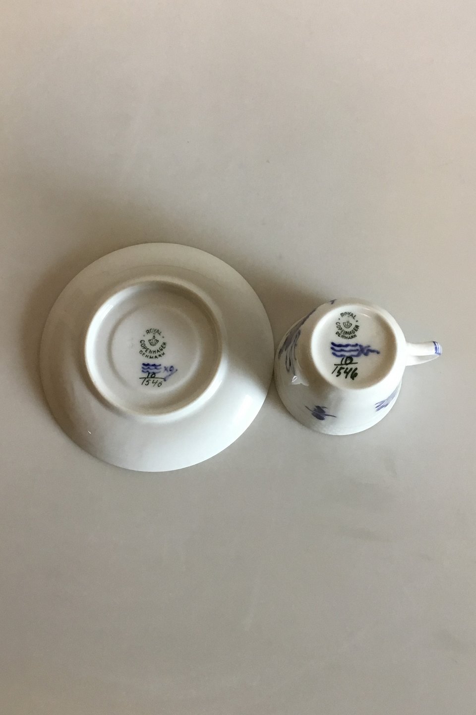 Royal Copenhagen Blå Blomst Svejfet Mokkakop med underkop No 1546. Måler 6 cm x 6,5 cm