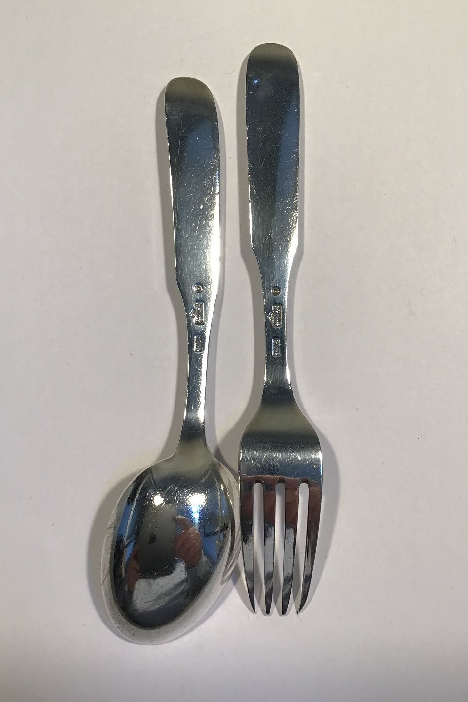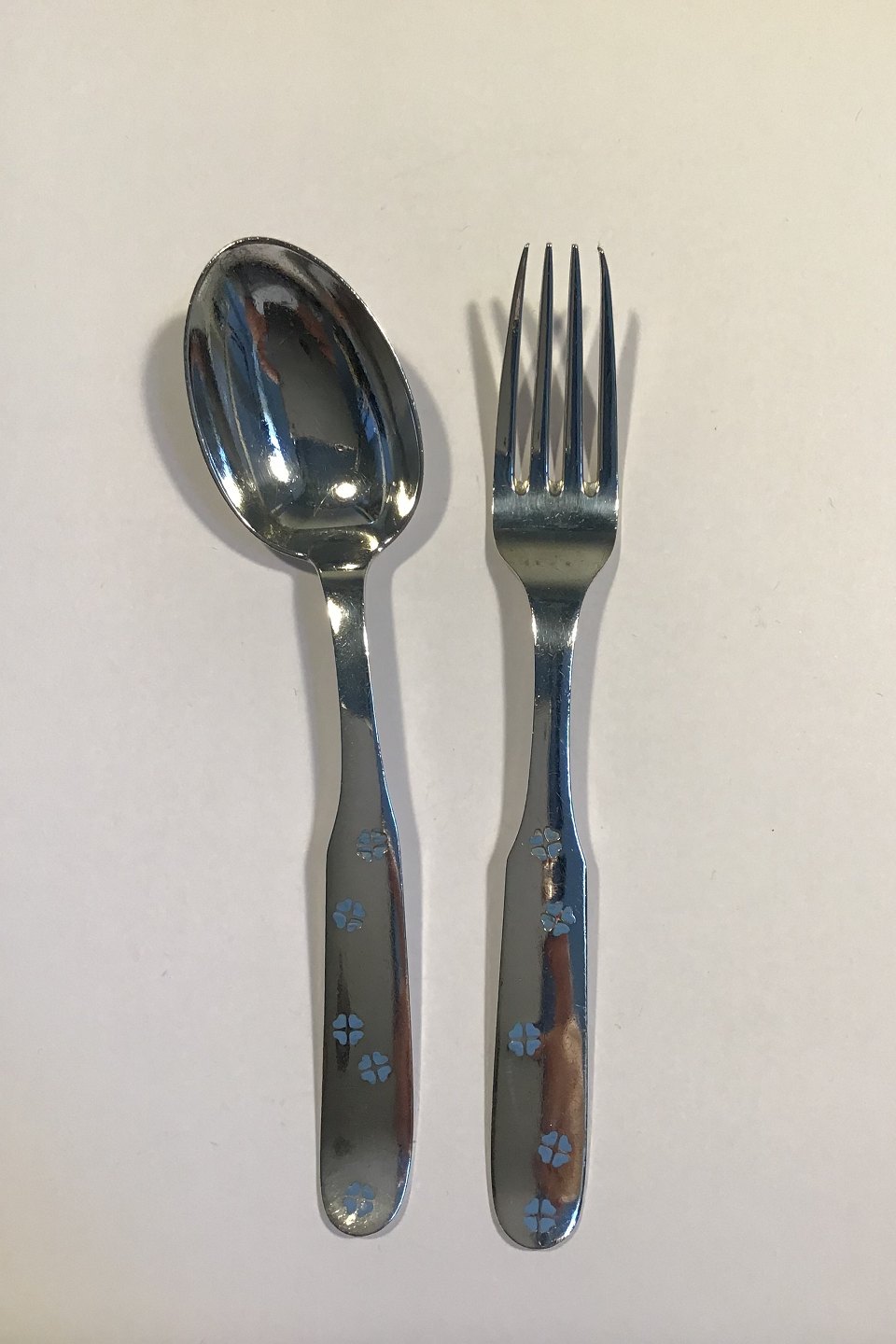 A Michelsen Sterling Sølv Barnebestik "Forglem mig ej" L Gaffel 15.5 cm Ske 15.2 cm Bemærk drejet laf