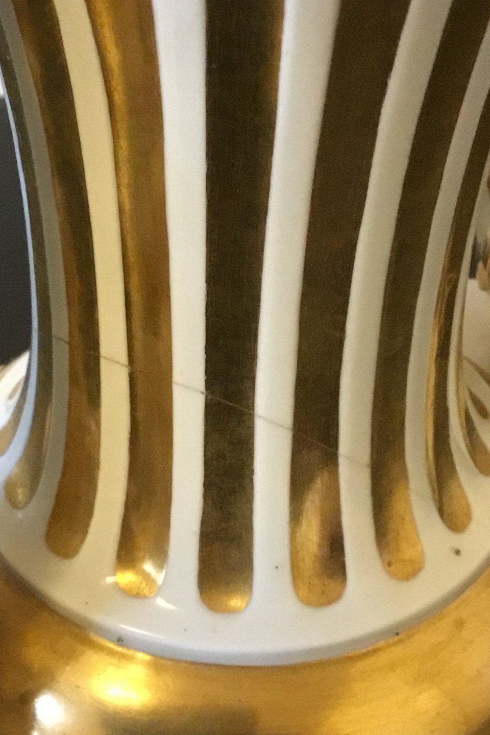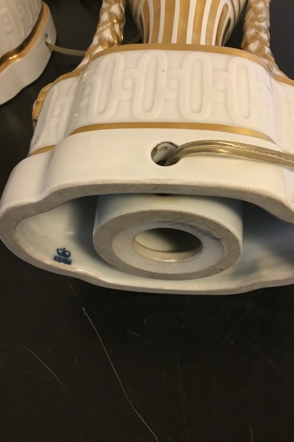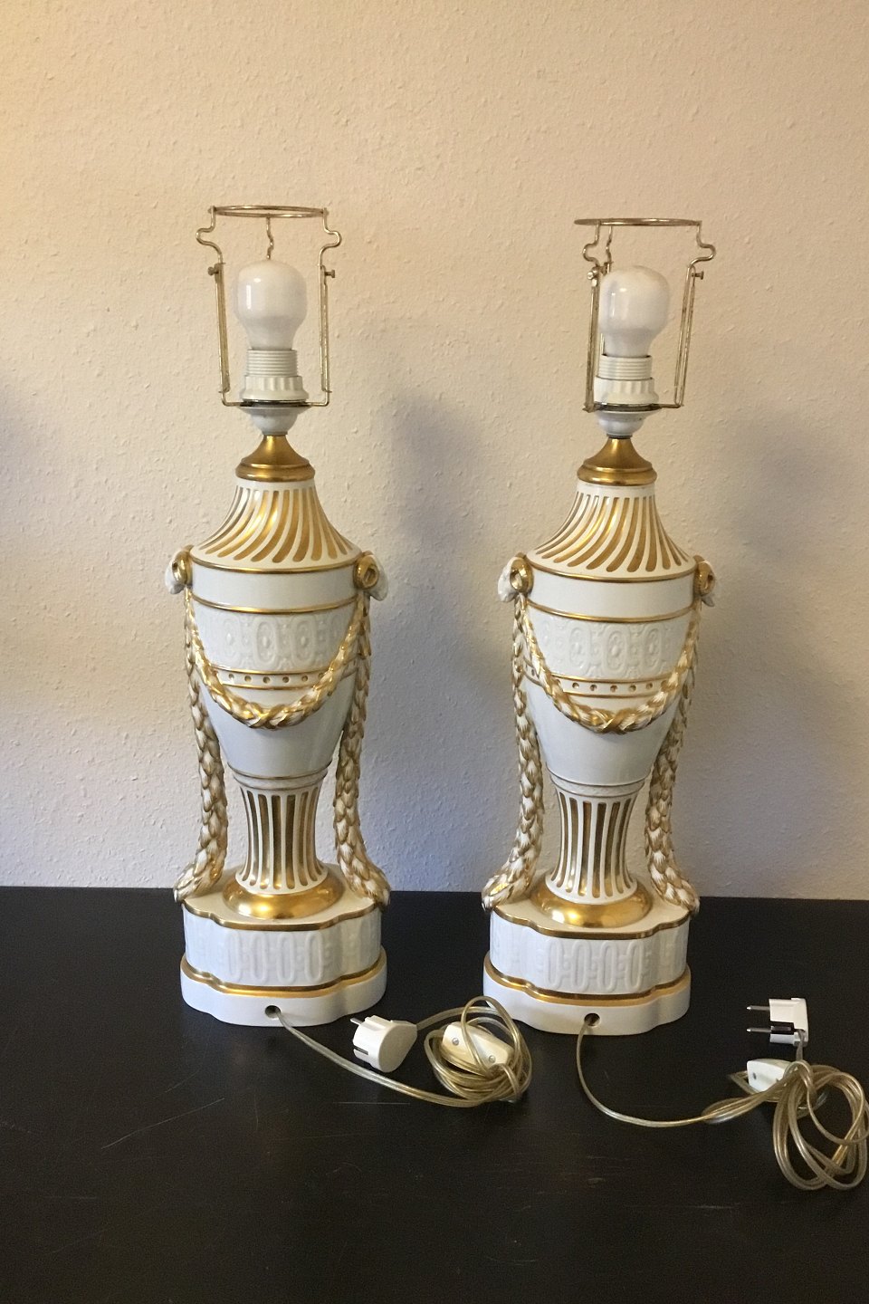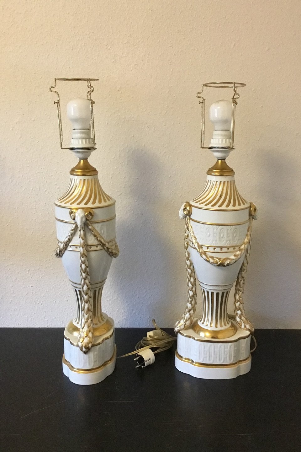 Royal Copenhagen A pair of baluster-shaped lamps on base decorated with garlands, Ram heads and gold. With Juliane Marie Stamp from 1905-12. Mounted with EL bulbs and wire. One with a crack otherwise in fine condition. Measures 65 cm / 25 19/32 in. incl. socket.