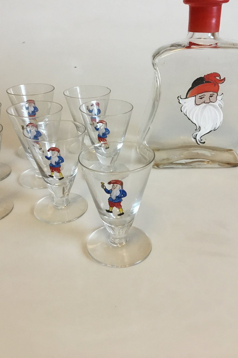 Christmas carafe with 8 small glasses. Decorated with Santa Claus. The Carafe is spherical grinded at the bottom and labeled "6". A glass with chip. Measures Carafe: 22 cm / 8 21/32 in. Glass: 7.5 cm / 2 61/64 in.