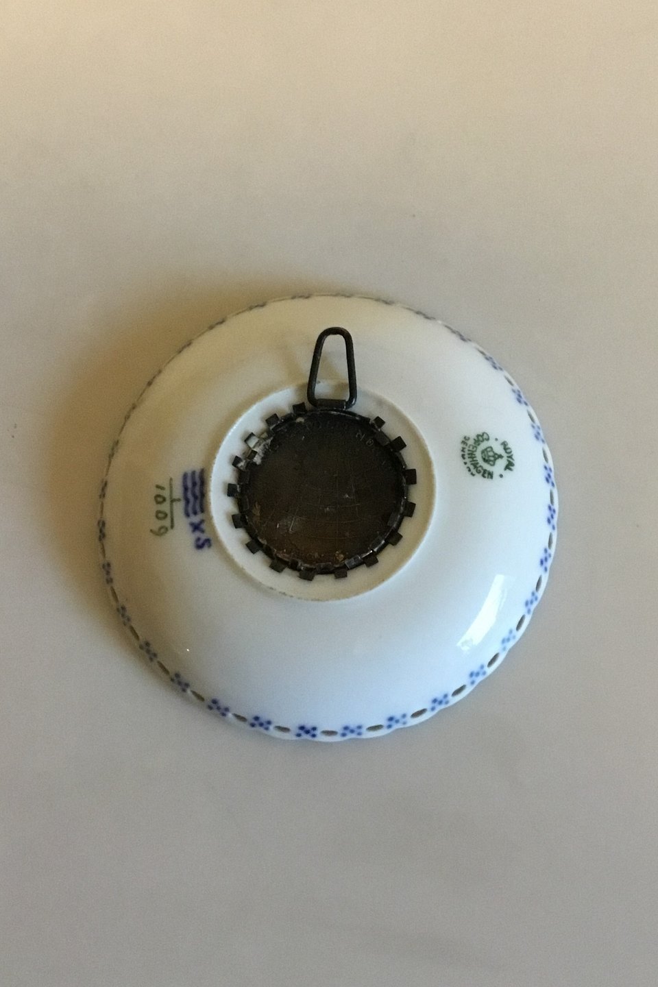 Royal Copenhagen Blue Fluted Full Lace Candle Drip Cup with 2-Crown coin with Frederik IX and Queen Ingrid, 1953. No 1009. Measures 9.4 cm / 3 45/64 in.