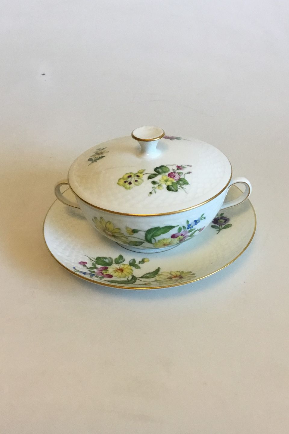 Bing & Grondahl Saxon Flower, White Bouillon Cup with Lid and Saucer No 247. Measures Cup: 8.5 cm / 3 11/32 in. x 12.5 cm / 4 59/64 in. dia. Saucer: 17.5 cm / 6 57/64 in.