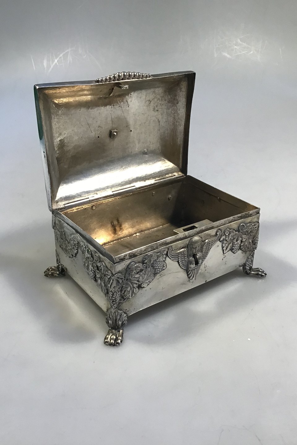 Silver Jewelrybox Decoration: Egyptian Goddess Maat/Isis Vines and floral rosette Unknown Hallmark L16.2 cm/6.37" x W 12 cm/4.72" x H 8.5 cm/3.34" Weight 468 gr/16.5 oz NB No key