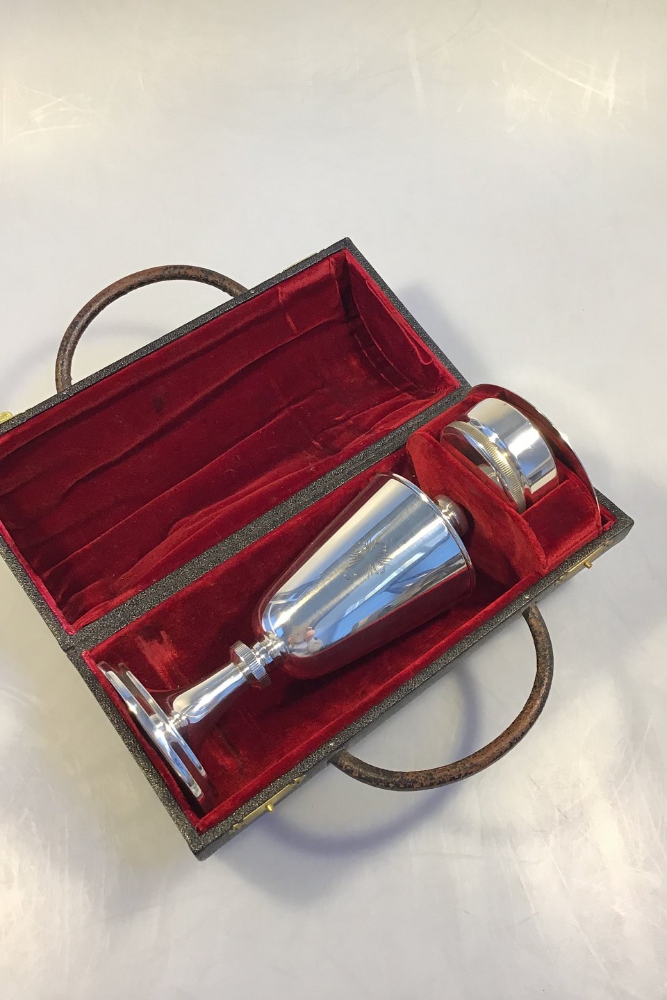 C.C. Hermann Tranportable Sterling Silver Altar Set comprising chalice, container, hostie box and -dish. Partially gilded. In fitted case. H. 18 cm./7.08" Diam. 9 cm./3.54" Weight 360 gr. /12.69 oz