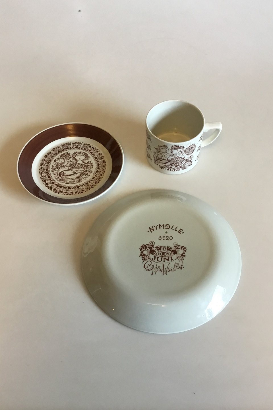 Bjørn Wiinblad for Nymølle Juni Månedskop med underkop No 3513 og kagetallerken No 3520. Måler Kop 7 cm x 8 cm dia. Underkop: 15 cm, Kagetallerken: 20 cm