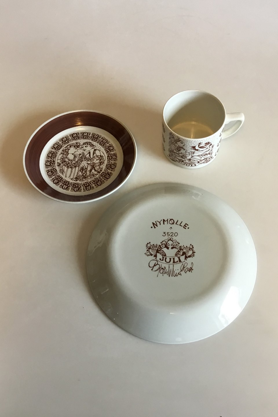 Bjørn Wiinblad for Nymølle Juli Månedskop med underkop No 3513 og kagetallerken No 3520. Måler Kop 7 cm x 8 cm dia. Underkop: 15 cm, Kagetallerken: 20 cm