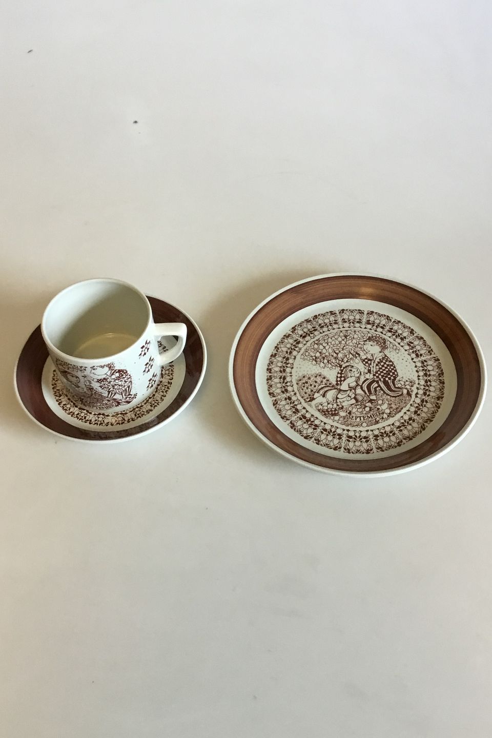 Bjorn Wiinblad, Nymolle September Month Cup No 3513, Saucer and Cake Plate No 3520. Measures Cup: 7 cm / 2 3/4 in. x 8 cm / 3 5/32 in. dia. Saucer: 15 cm / 5 29/32 in. Cake Plate: 20 cm / 7 7/8 in.