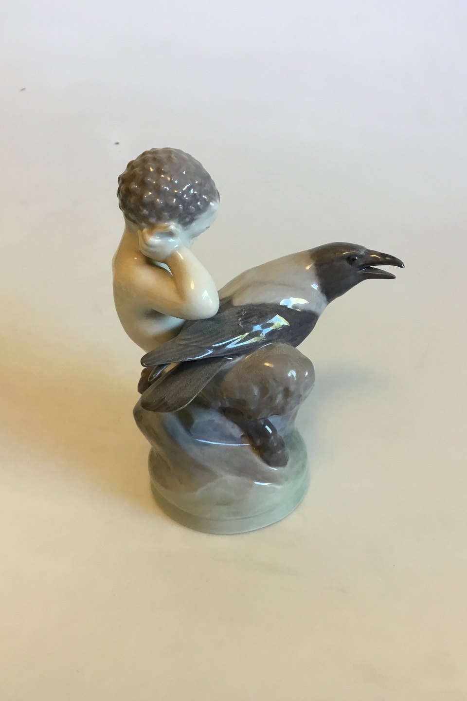Royal Copenhagen Figur af Faun med med en krage No 2113. Måler 16 cm