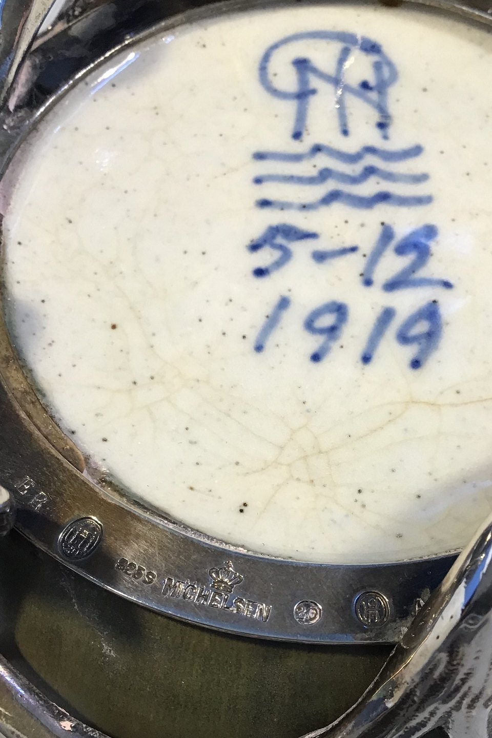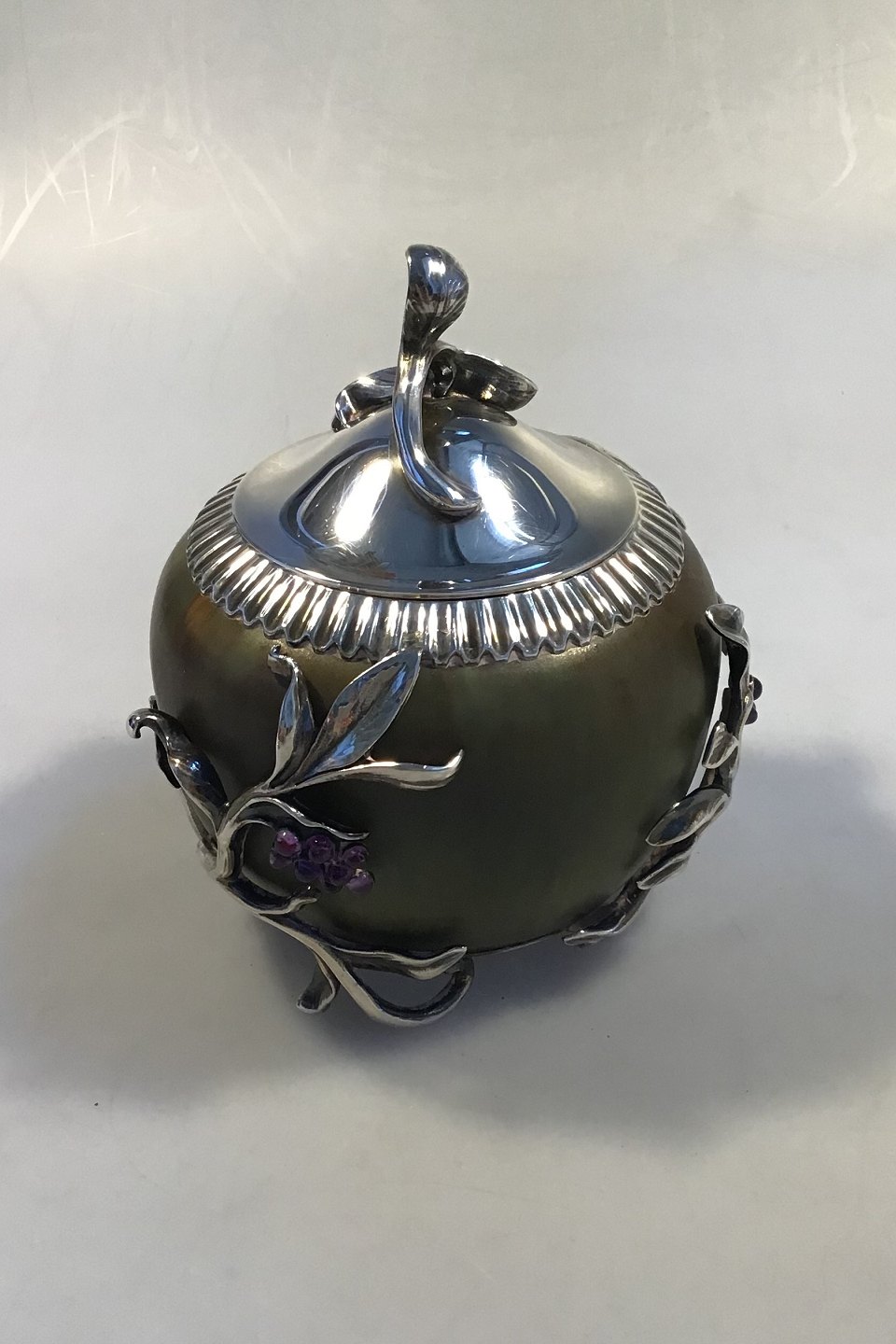 Royal Copenhagen. Jar in stoneware with green Sung glaze, Anton Michelsen mounting with lid in sterling silver with leaves and grape bunches of a total of 30 amethysts. Signed PN, with three waves and dated 5/12 1919. Silver mounting hallmarked Michelsen, 1920, ER, 925S, assay master Carl Frederik Heise. H. incl lid 14.5 cm(5.70 in). Diam 12 cm. (4,72 in)