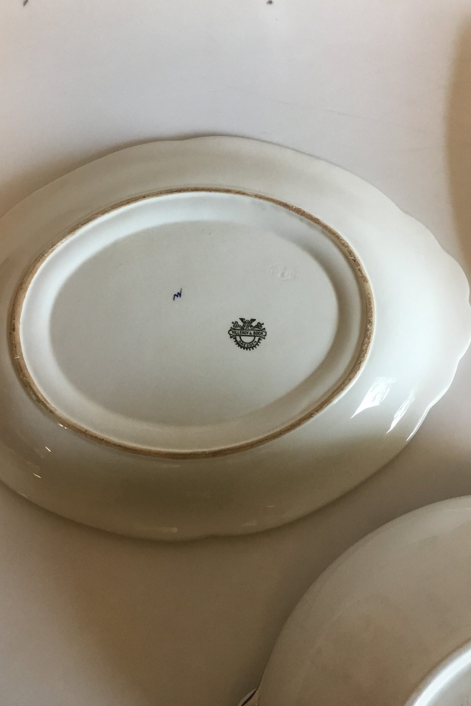 Villeroy & Boch Blå Olga Oval terrin på underfad. Måler 37 cm x 28 cm x 21 cm