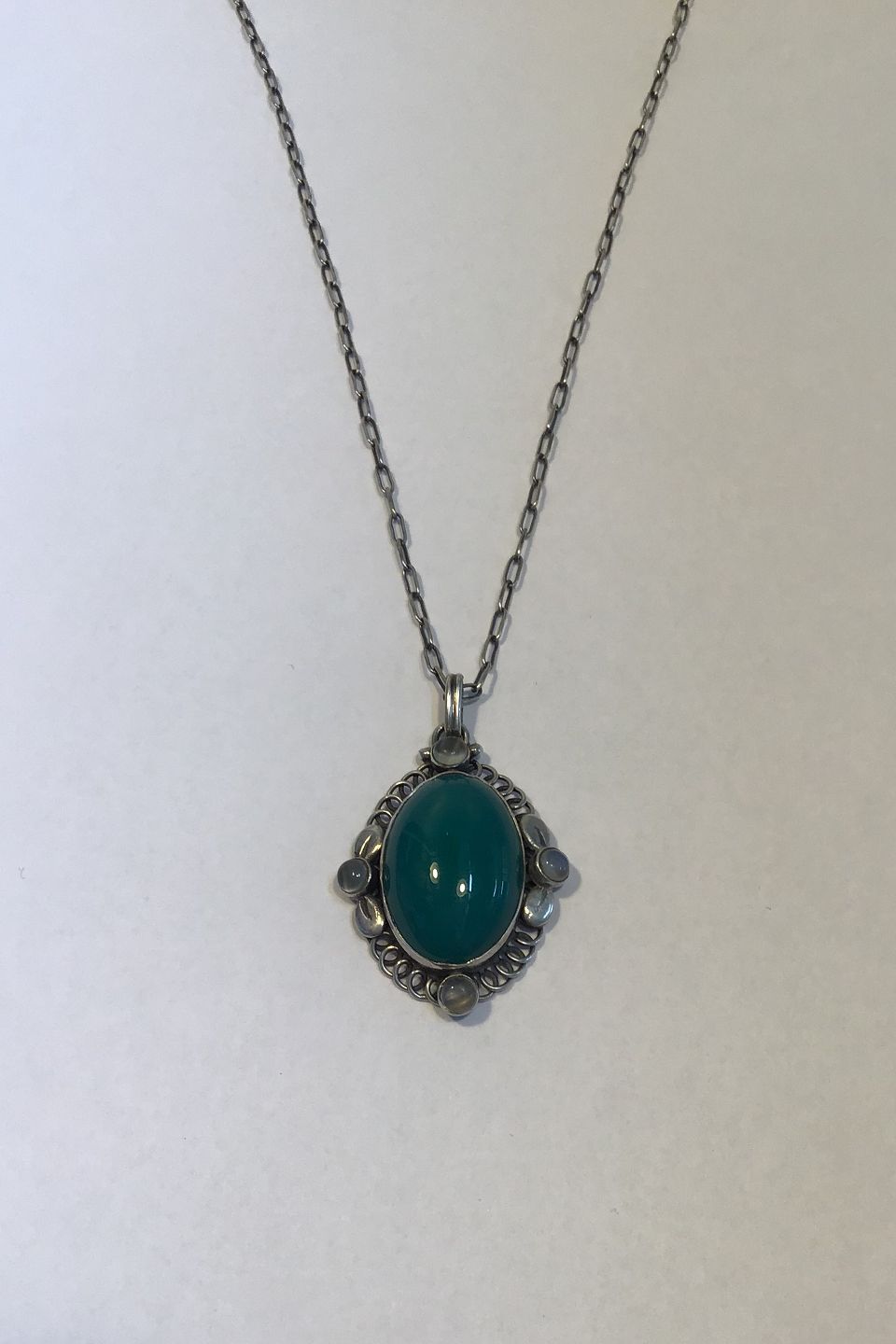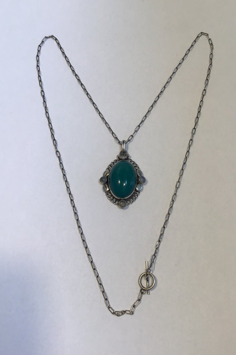 Georg Jensen Sterling Silver Necklace with Pendant No 10 Green Agat and 4 Moon Stones Chain 60 cm (23.62 in)Pendant 4.4 cm x 2.7 cm(1.73in x 1.06 in) Combined Weight 13.4 gr/0.47 oz
