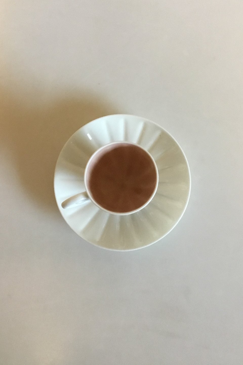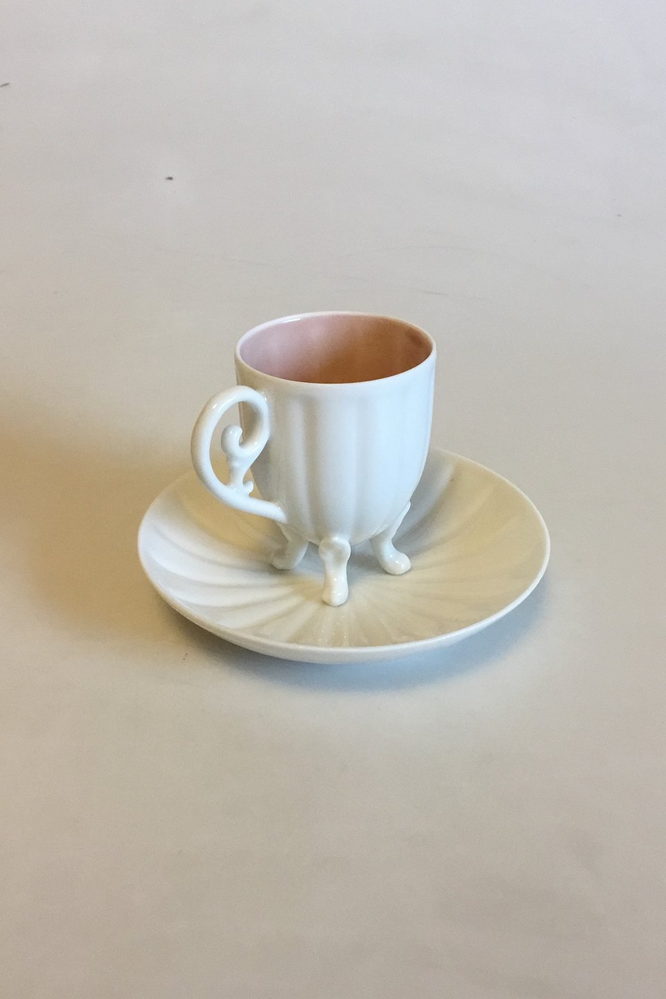 Bing & Grondahl Art Nouveau Mocha cup with saucer. Cup on four legs and inside with pink glaze. Measures Cup: 7 cm / 2 3/4 in. x 5.5 cm / 2 11/64 in. dia. Saucer: 12 cm / 4 23/32 in.