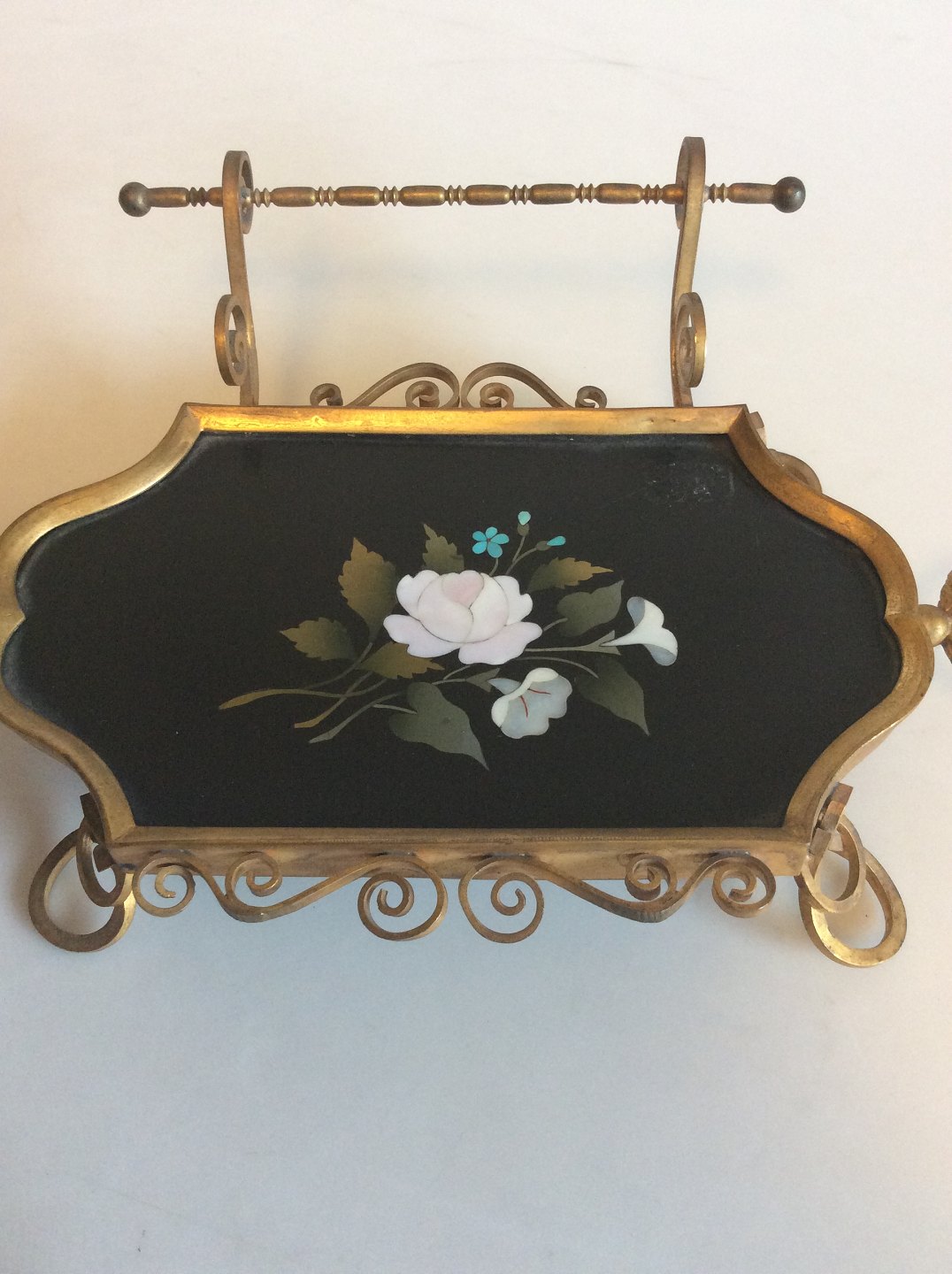 Gammel skrivesæt ?. Udført af messing og poleret skifer med ilagt blomsterdekoration af farvede sten. Måler 24 cm