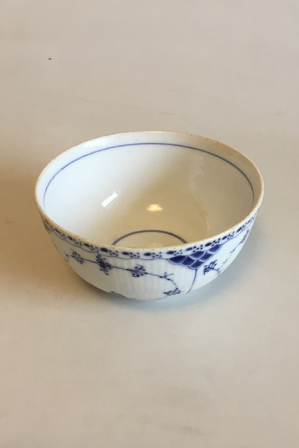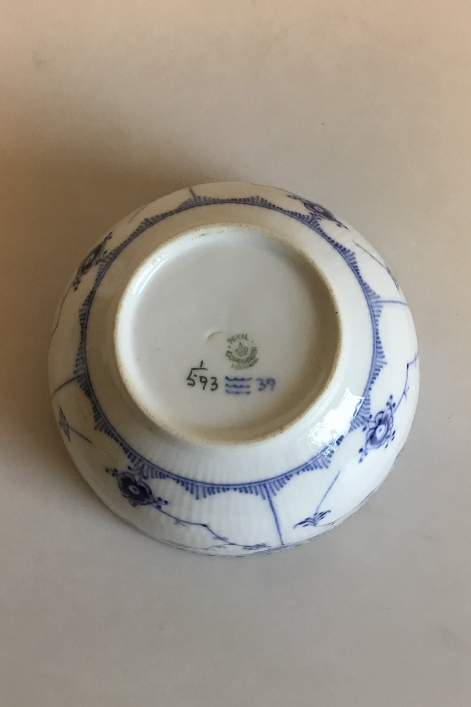 Royal Copenhagen Blue Fluted Half Lace Bowl No 593. Measures 7.4 cm / 2 29/32 in. x 14.7 cm / 5 25/32 in. dia.