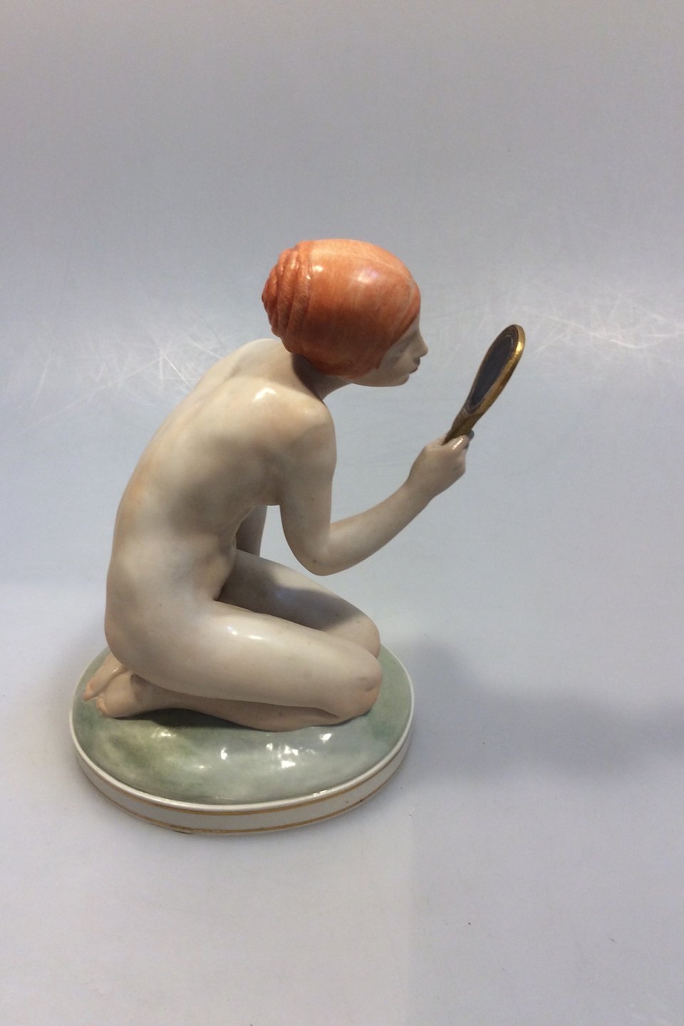 Royal Copenhagen Figur af pige med spejl No 1244. Designet af Gerhard Henning. Dateret 7-12-1923. 2. sortering. Måler 18 cm