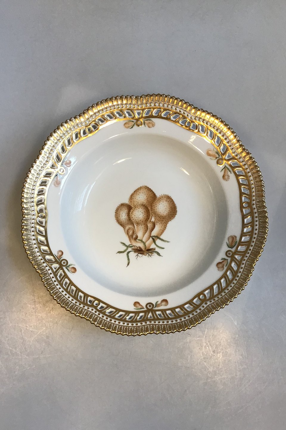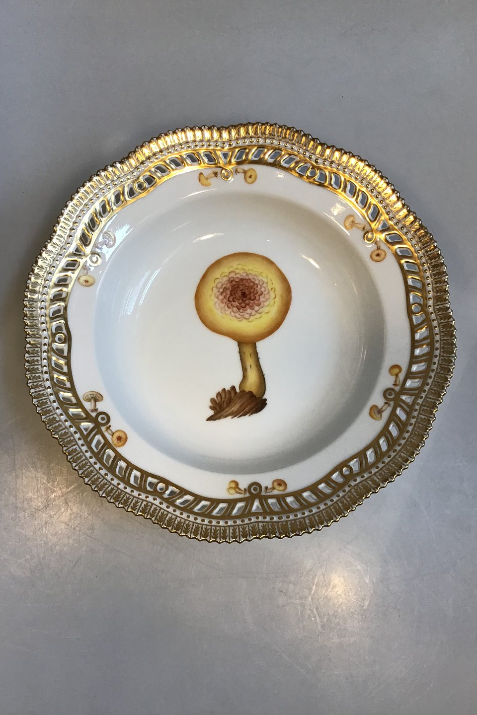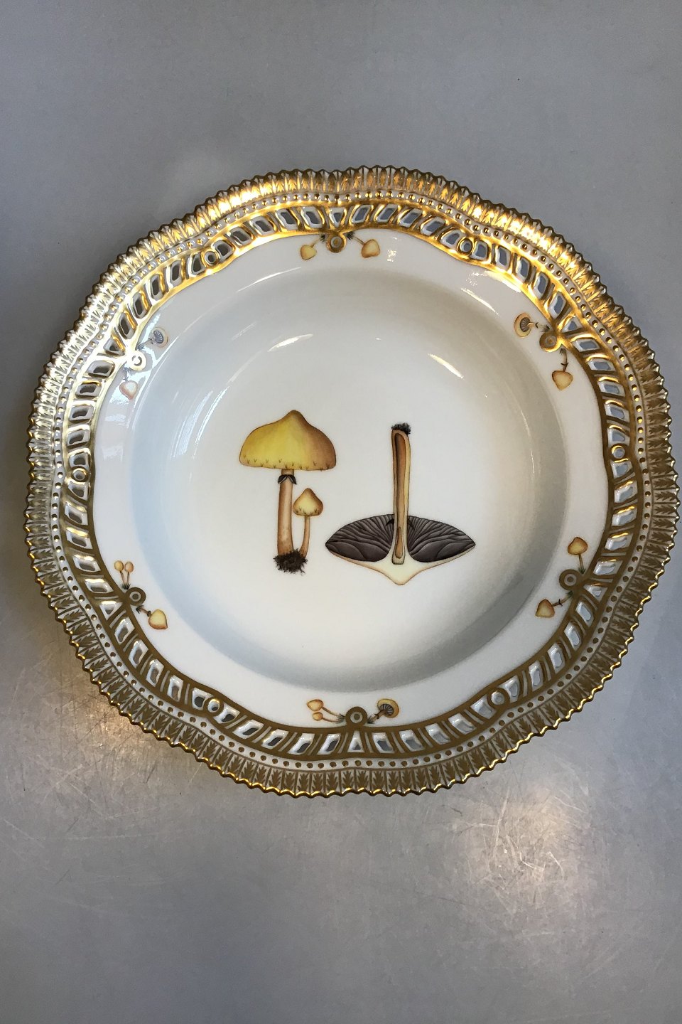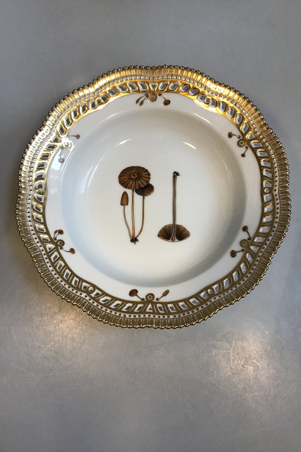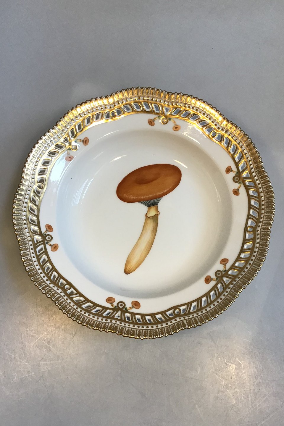 Royal Copenhagen Flora Danica Deep Plate with pierced border No 634 (20/3547) Latin Names Agaricus scaber Müll, Lycoperdon gemmatum Batsch, Agaricus glutinosus Vahl, Agaricus nitens Vahl, Agaricus semistriatus Vahl, Agaricus torminosus Schäff. All fungi motifs