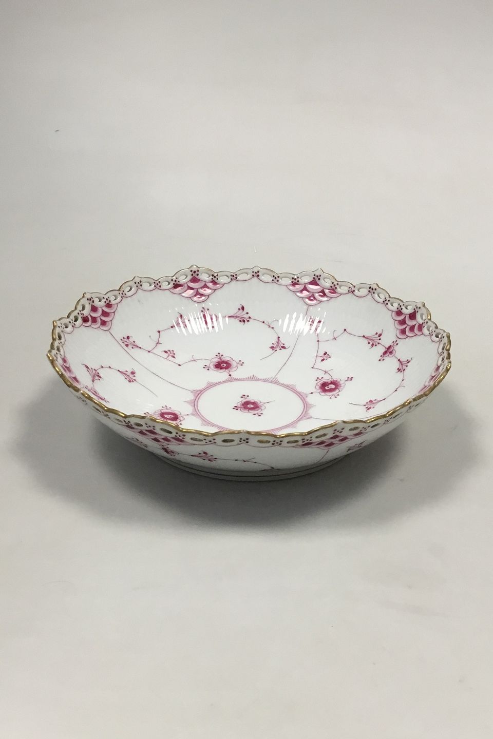 Royal Copenhagen Blue Fluted Red Ruby/Pink with Gold Edge Full Lace Low Bowl No 2/1018. Measures 5.3 cm / 2 3/32 in. x 20.5 cm / 8 5/64 in.