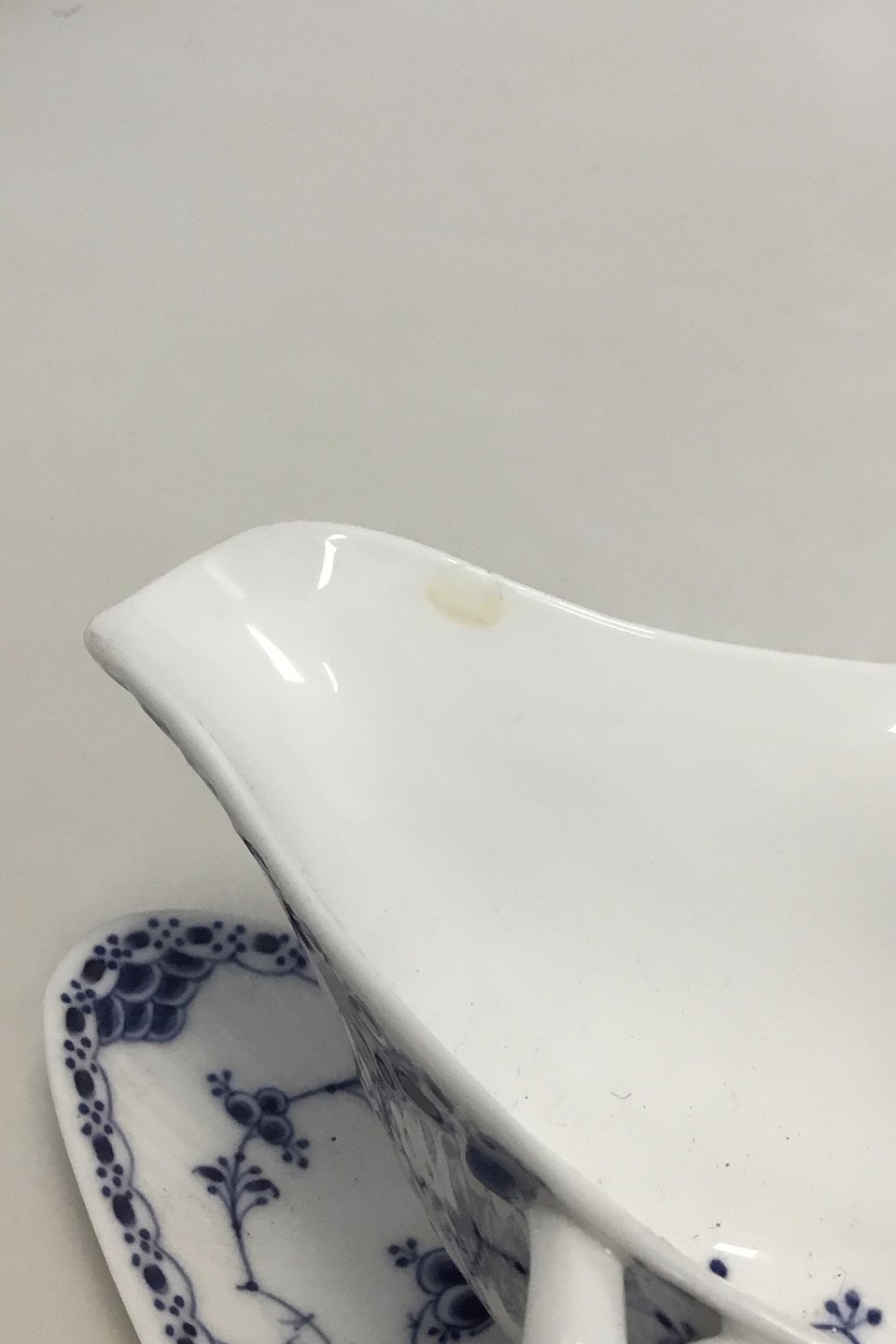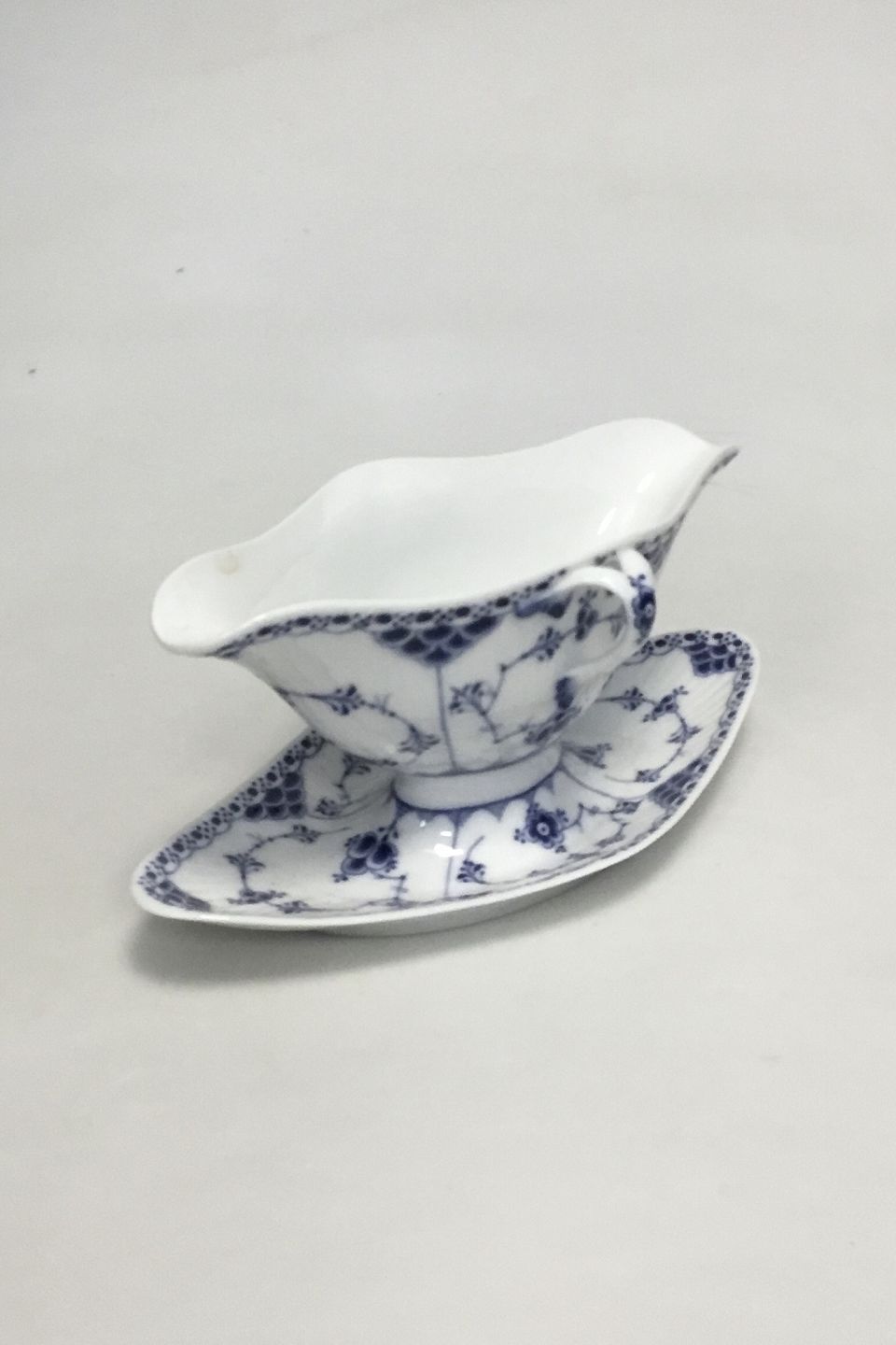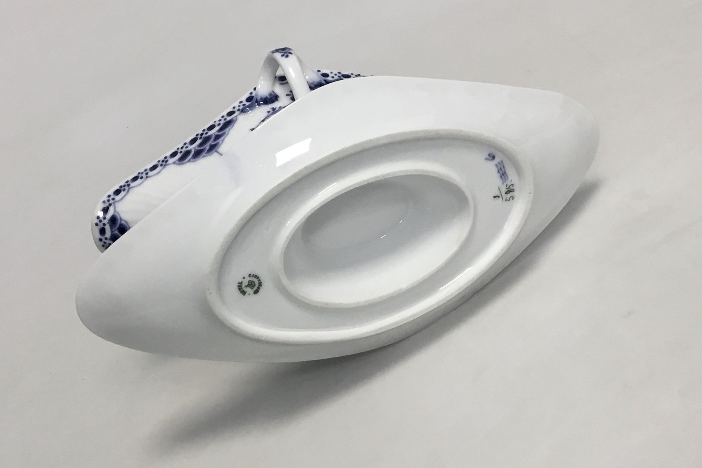 Royal Copenhagen Blue Fluted Half Laced Saucebowl with Handles no. 585. Modelled by Erik Nielsen 1890. 10 x 22 cm (3 15/16" x 8 21/32"). Chip under side and a glued chip upper inner rim. Please see pictures