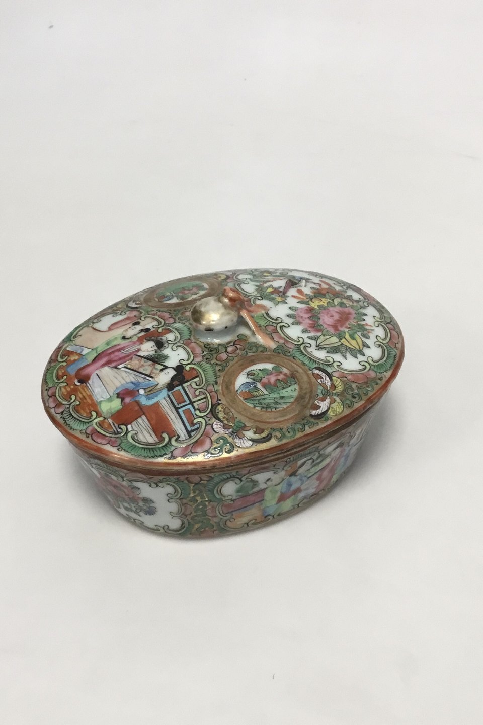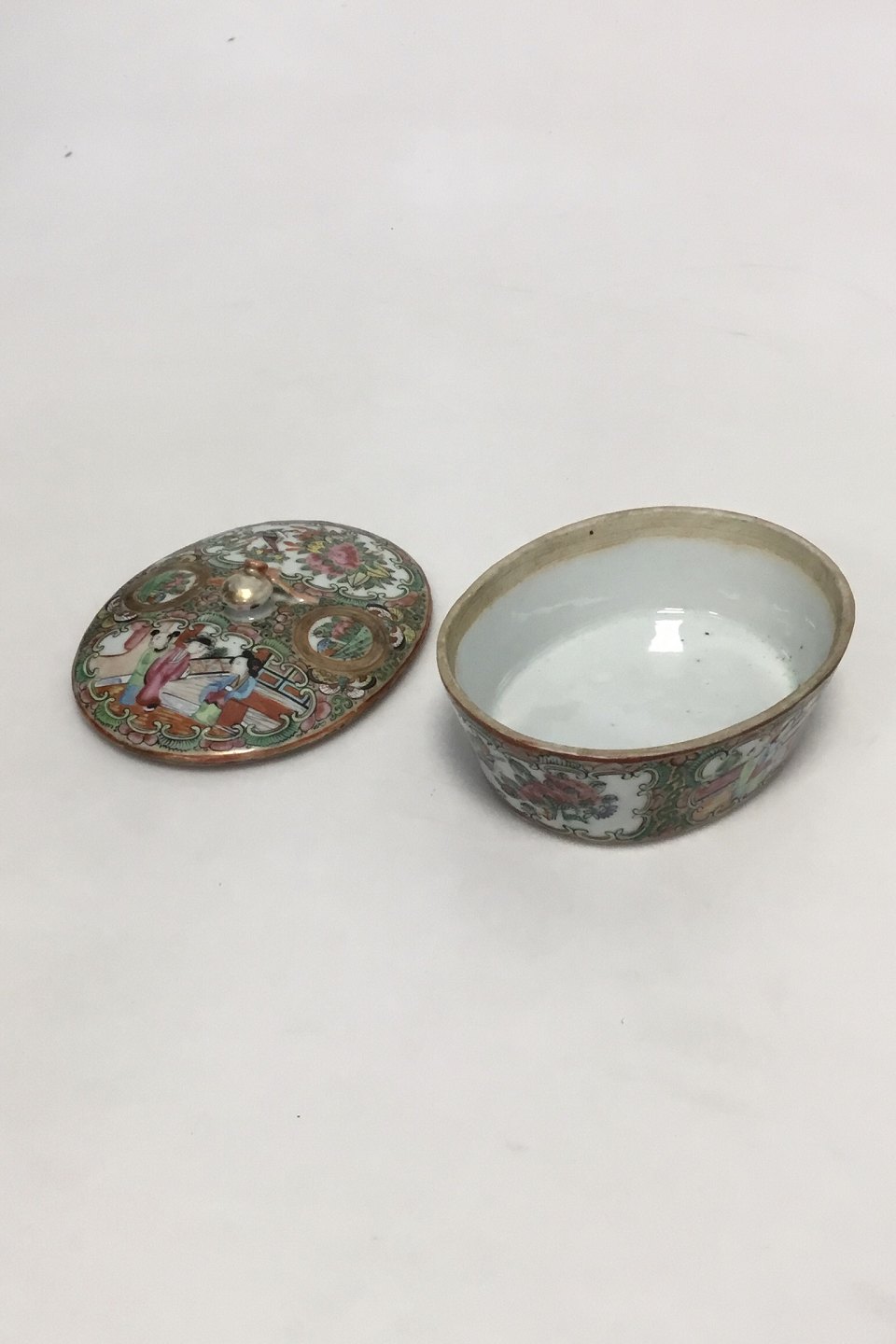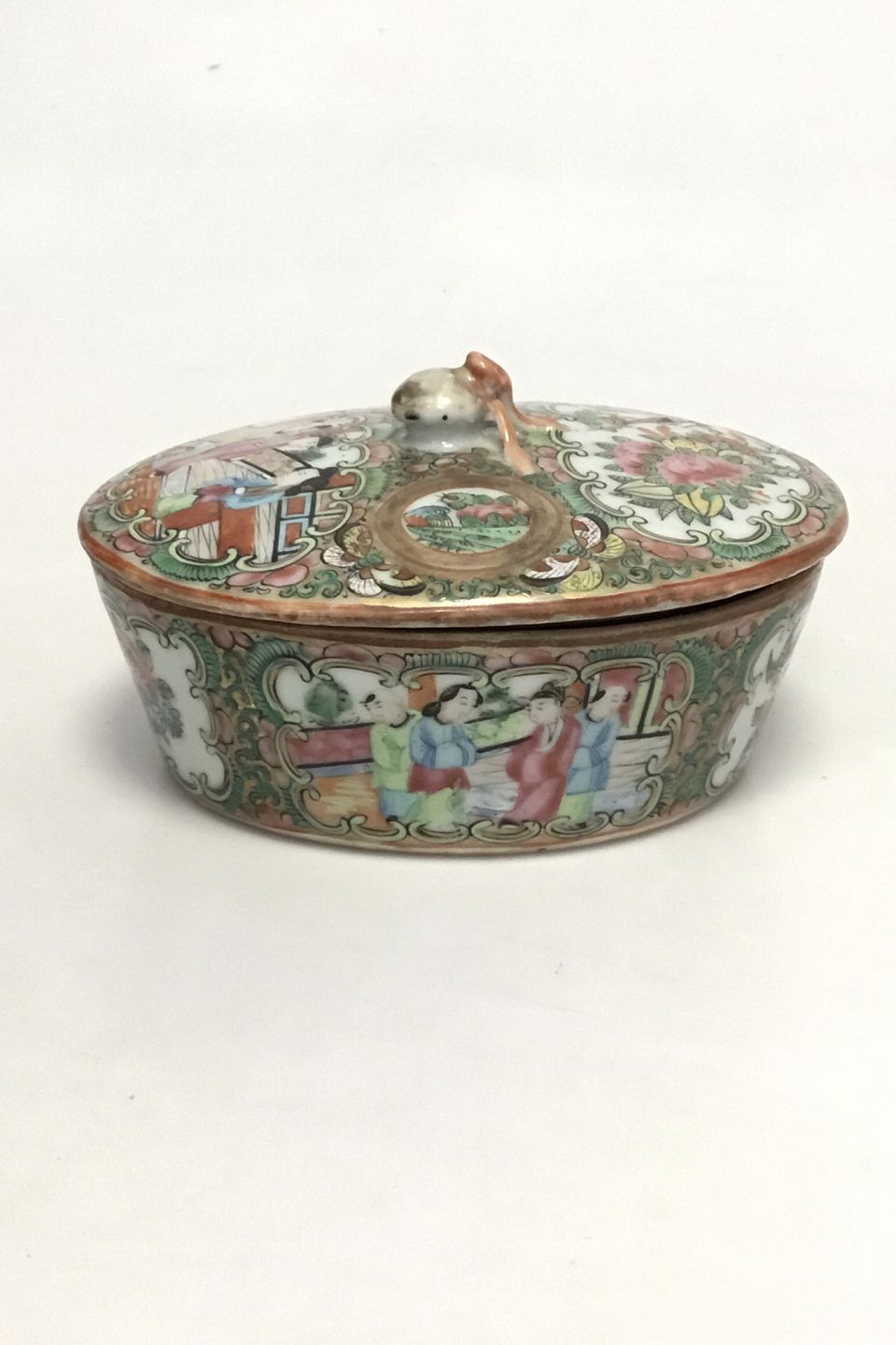 Kinesisk canton porcelæn (gold & green) terrin. Med paladsscener samt fugle og sommerfugle. Ca. 1850. L: 13 cm, H: 6,5 cm