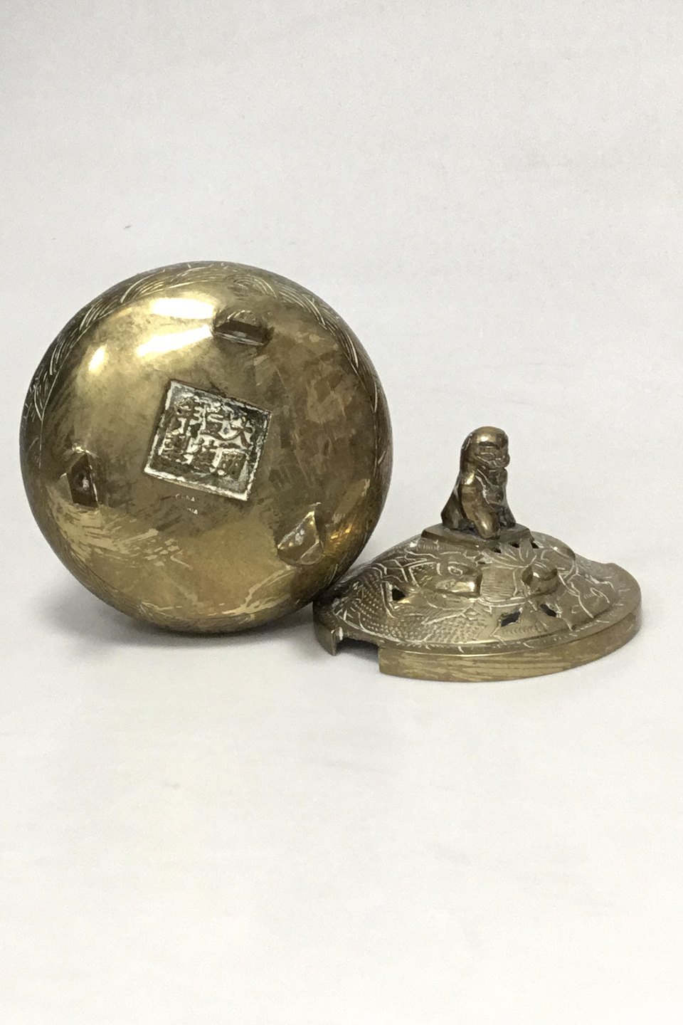 Kinesisk røgelseskar i messing med gennembrudt låg prydet med foo hund. Midten af 20 årh. H: 16,5 cm
