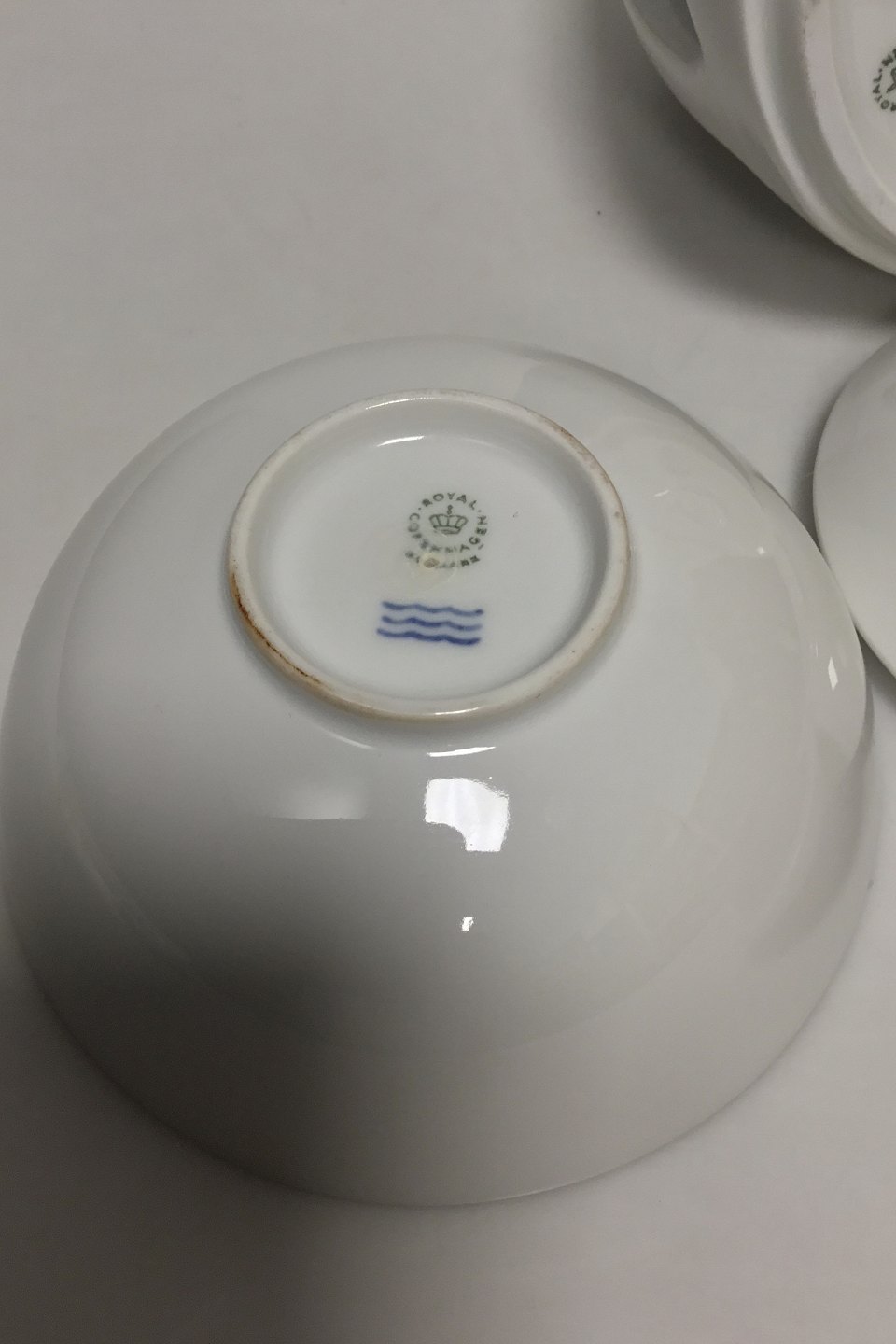 Royal Copenhagen white porcelain Coffee Pot with lid, small tray, egg cup and bowl, all in one. Lid with damages, please see pictures. H: 20 cm (7 7/8")