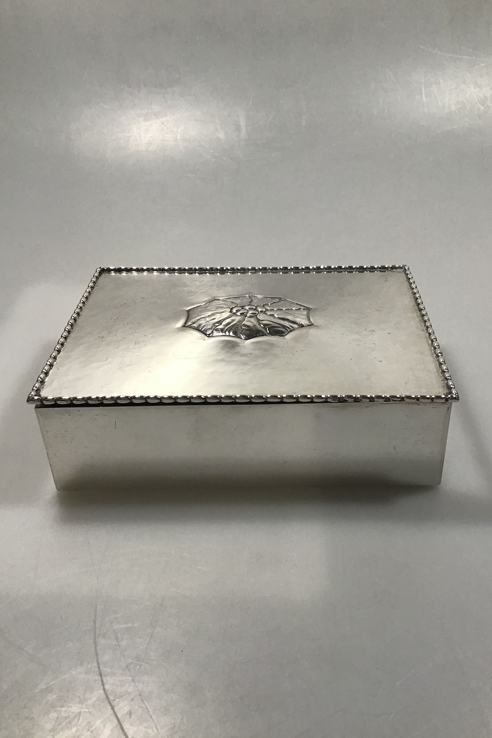 Georg Jensen Sølv Lågskrin/Tobakæske No 195 med indlæg af træ 1915-1927 Måler 18 cm x 13.5 cm x 5 cm Vægt 818 gr/28.9 oz Svenske import Stempler