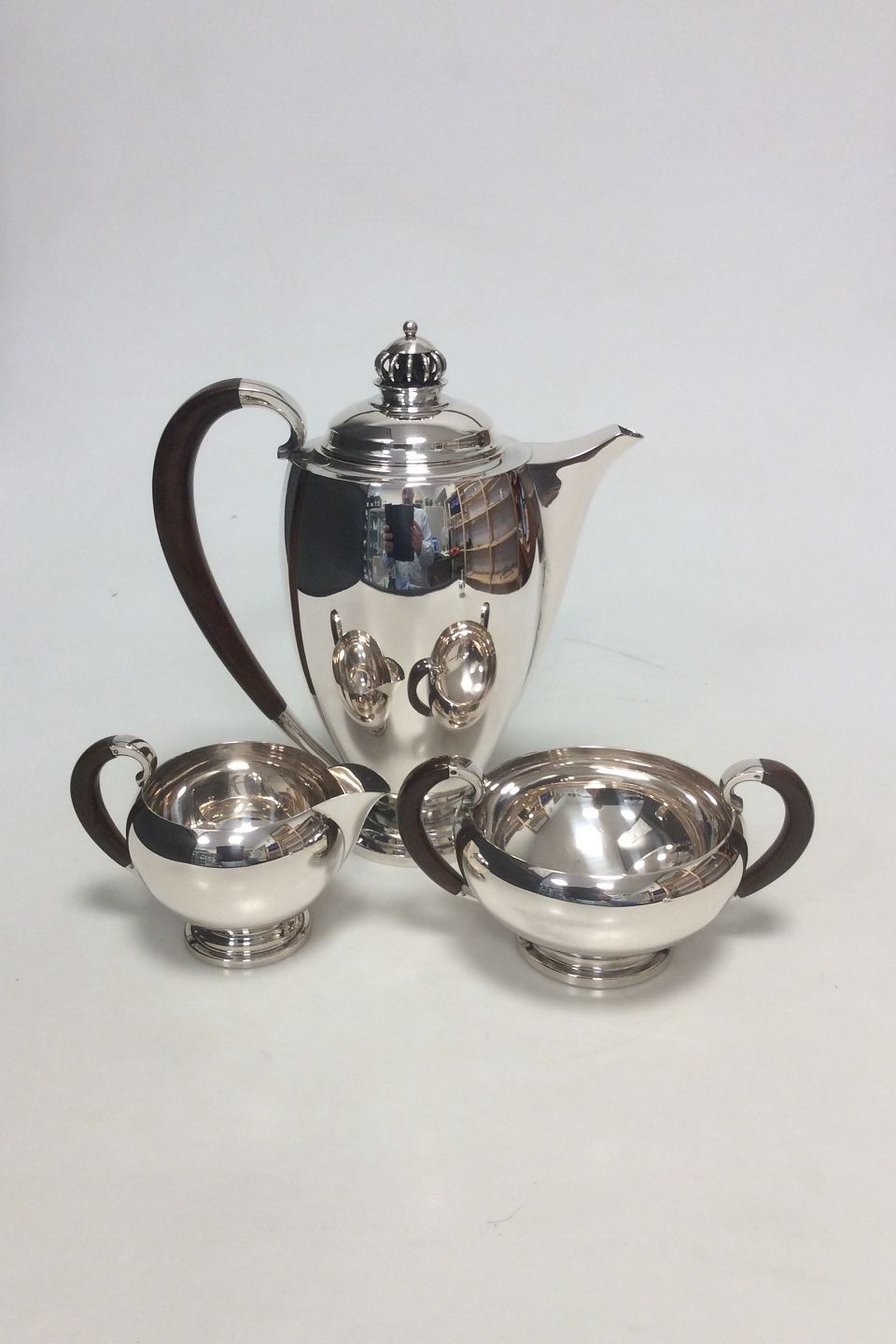 Theodor Sabroe Art Deco Danish Silver Coffee Set with Pot, creamer and sugar bowl from 1942.