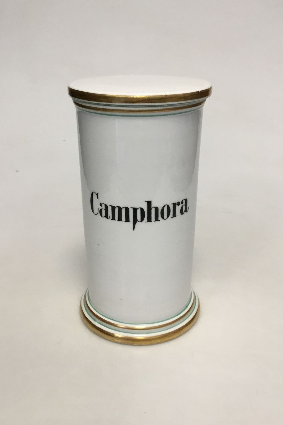 Royal Copenhagen Pharmacy Jar. Text "Camphora". Measures 21.5 cm / 8 15/32 in. Small chip on the inside of Lid