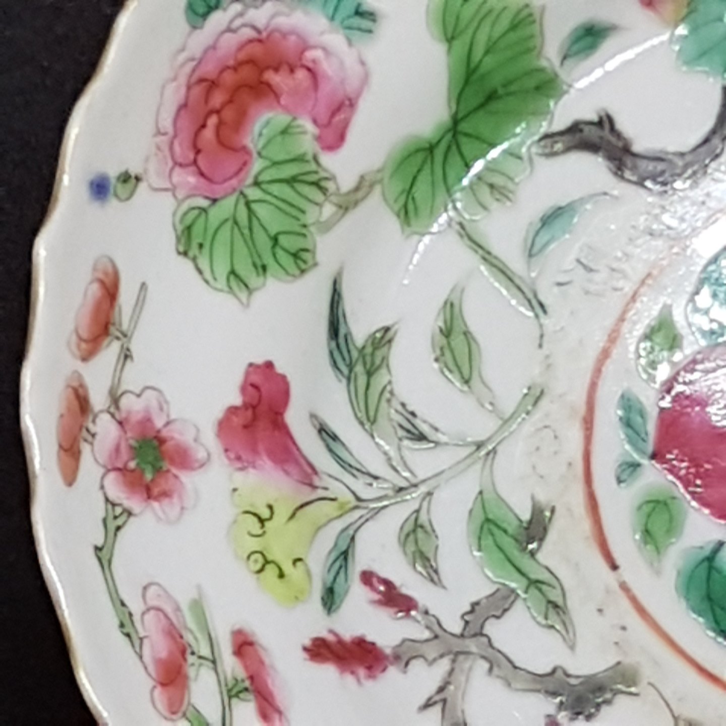 Kinesisk famille rose porcelænstallerken med Daoguang (1820-1850) mærke og fra perioden. Flot dekoreret med ferskner og flagermus i centrum, samt blomster og blade rundt om. Bagside med flagermus og periodemærke. Svejfet kant med guldbemaling. Mindre brændingsfejl på kant. Diameter 13,5 cm.