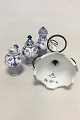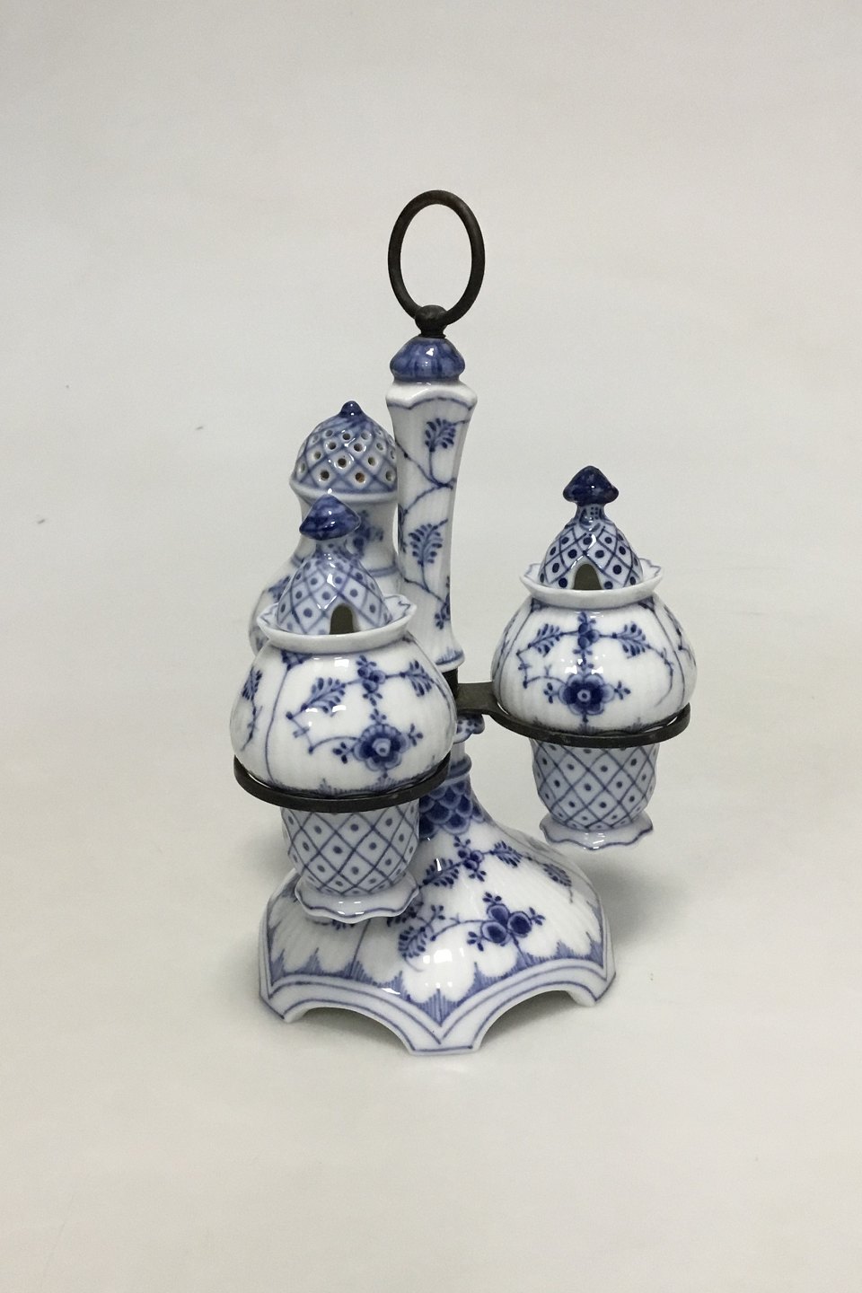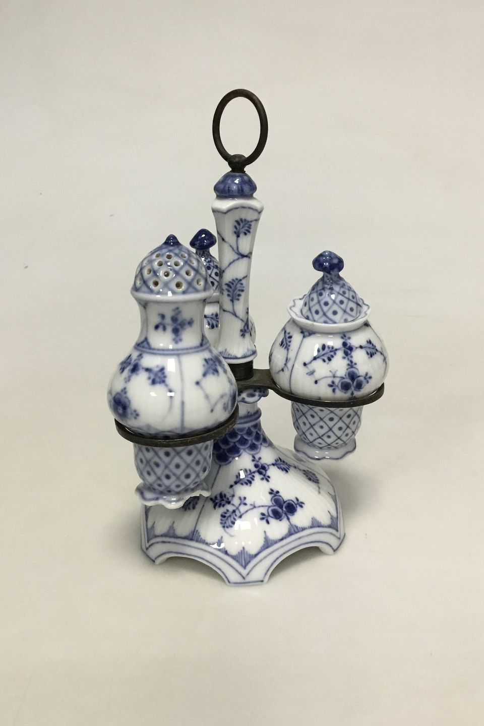 Royal Copenhagen Musselmalet Riflet Plat de Ménage No 62. Roterbar holder af messing. Måler 17 cm (6 11/16 in.) høj. Afslag på foden af saltbøsse