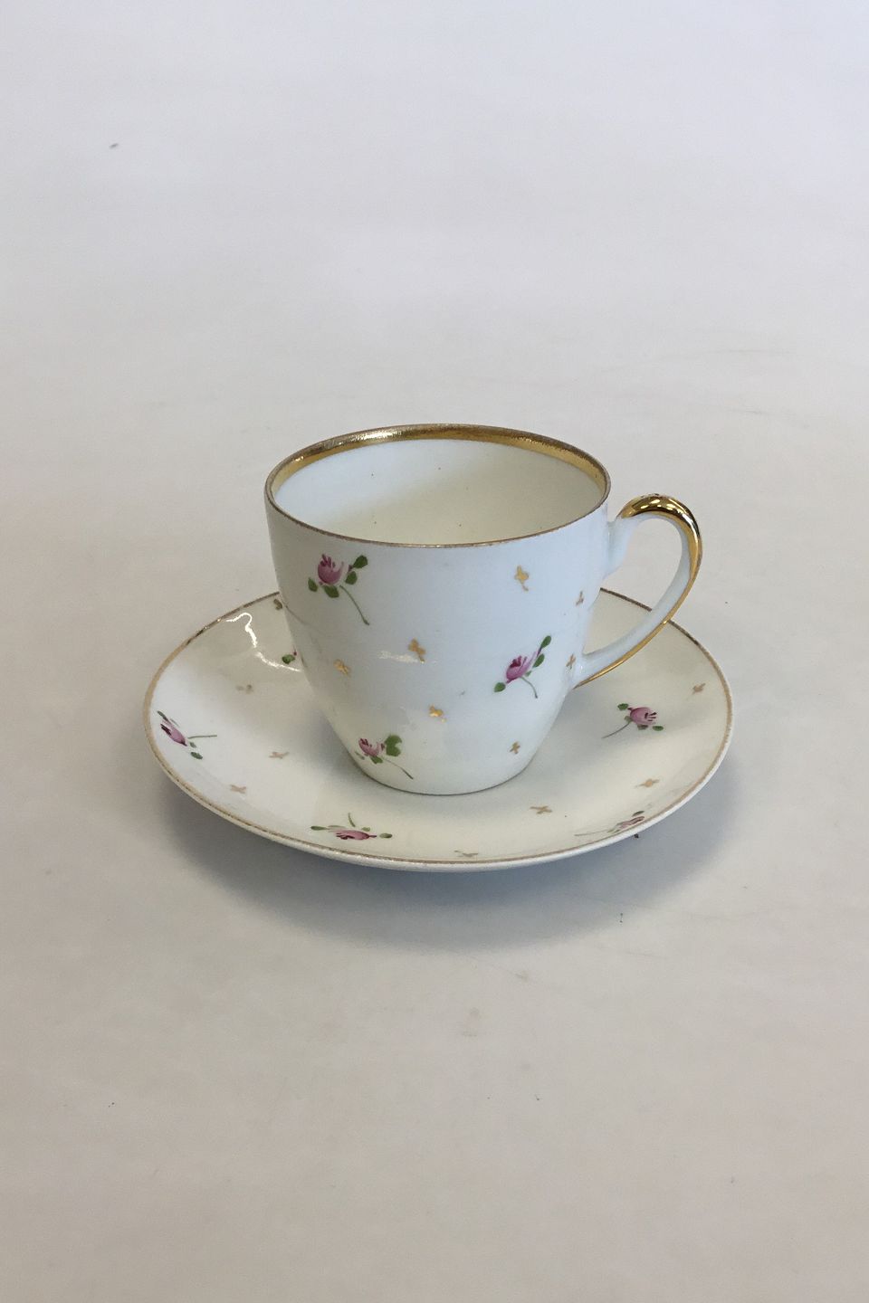 Bing & Grøndahl Gammel Kaffekop dekoreret med små blomster og guldkløver. Måler Kop: 6,5 cm x 7,5 cm dia. Underkop: 13,5 cm. Lidt slid på guldkant
