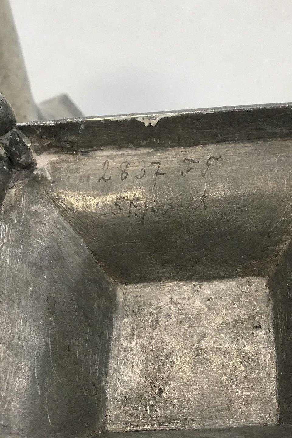 Et par hammerslåede tinlysestager med firkantet base. Med skævheder i lysmanchetten. Måler 11,5 cm(4 17/32 in.)