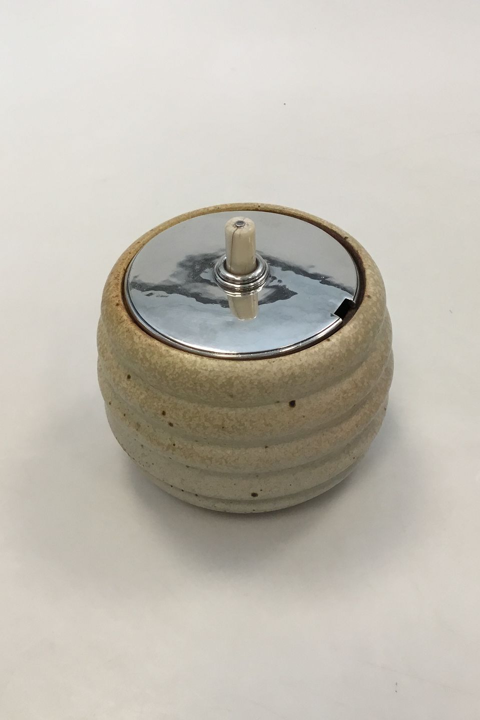 Bode Willumsen Hans Hansen Marmeladekrukke Sterling Sølv låg. Marmeladekrukke af stentøj i lys nuance med riller. I bunden sign. Bode Willumsens og Hans Hansens monogram 1937, låg af sterlingsølv med håndtag af ben udført hos Hans Hansen af Karl Gustav Hansen, låget stemplet 1937. Måler 10,5 cm x 10,5 cm dia.