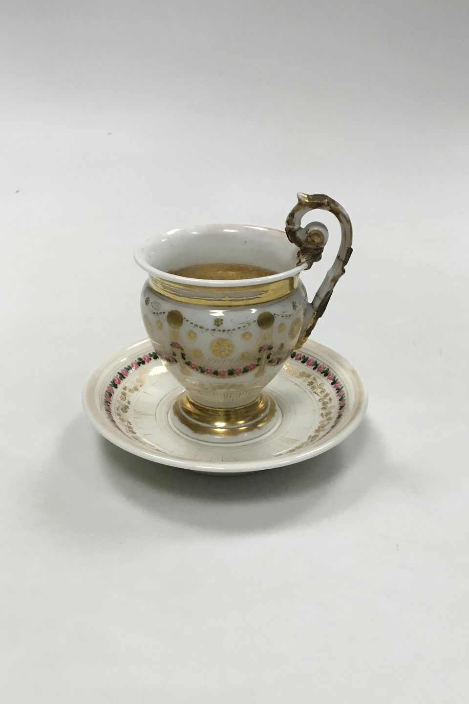 Old Cup and Saucer Decorated with Flowers and gold. Repair on handle and wear. Measures 12 cm / 4.72 inch