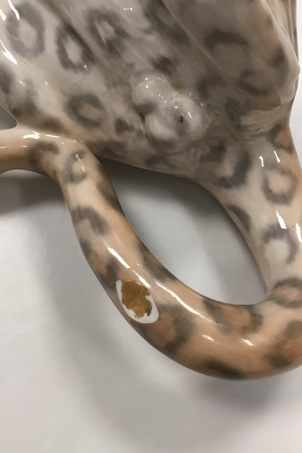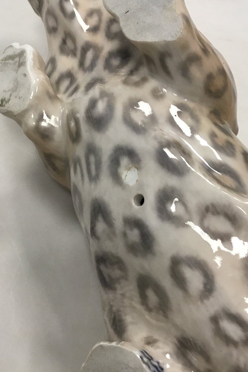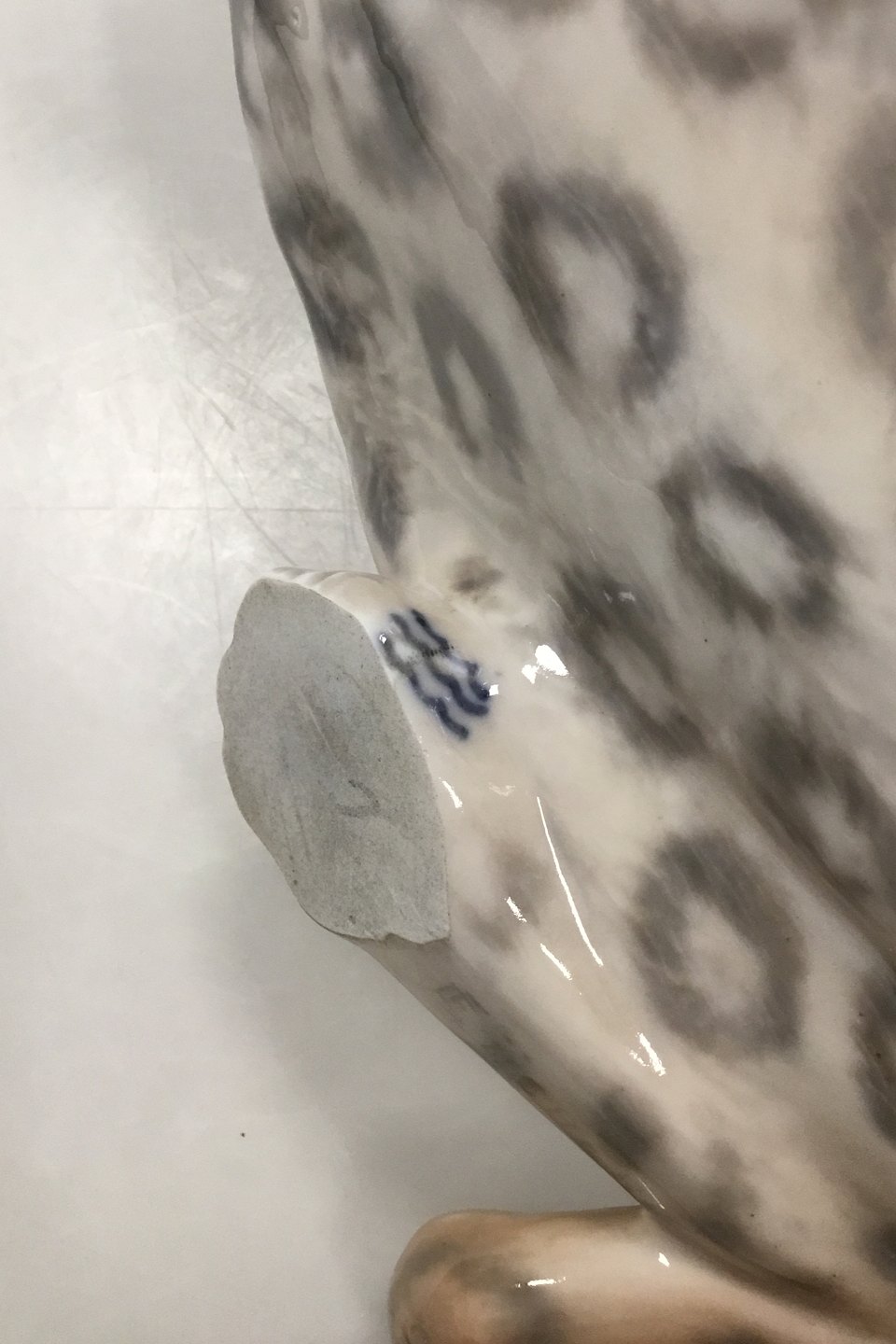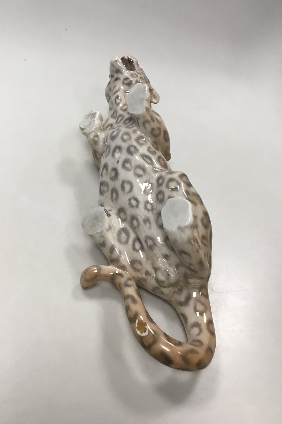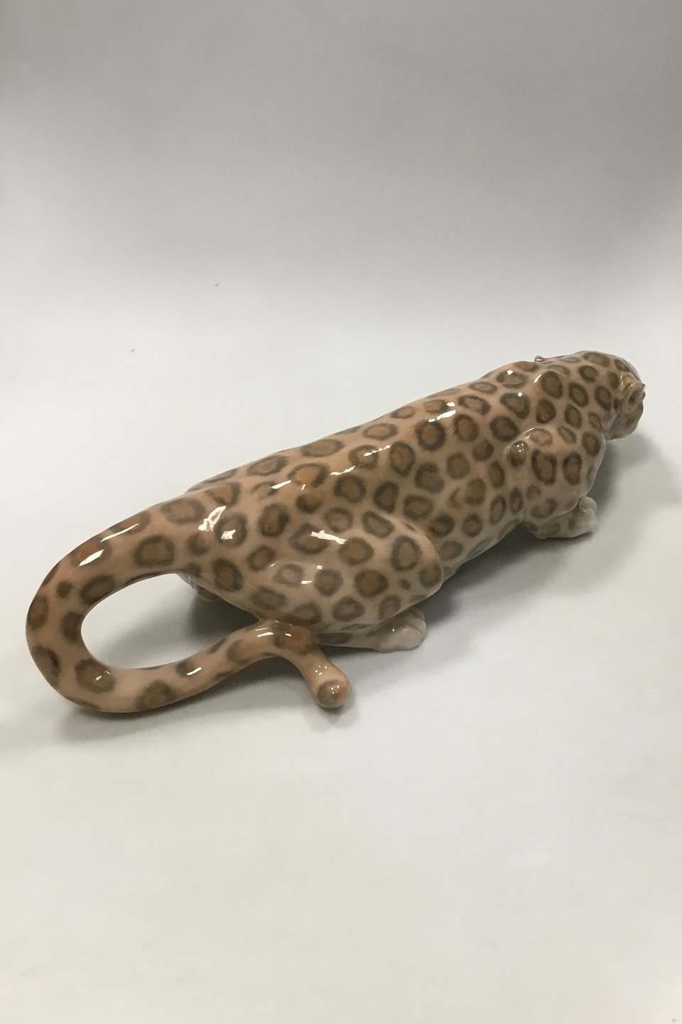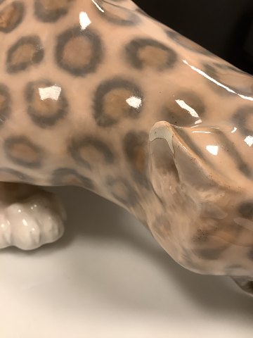 Royal Copenhagen Figur Kravlende Leopard No 472. Måler 47 cm x 10,5 cm ( 18.50 in. x 4.13 in. Designet of signeret af Carl Frederik Liisberg. Fremstår med afstøbningsmærker og mindre afslag på øre