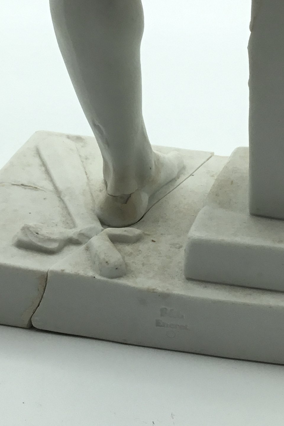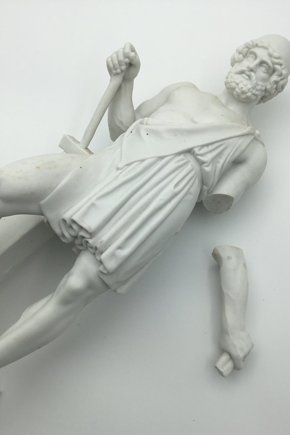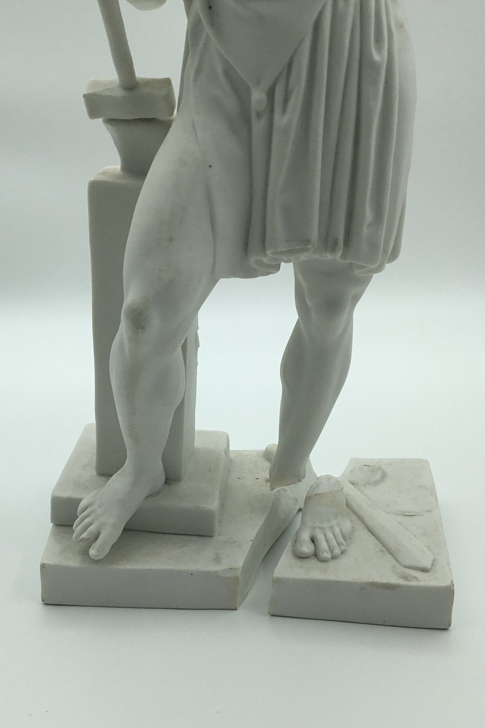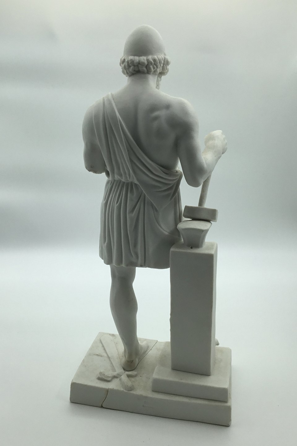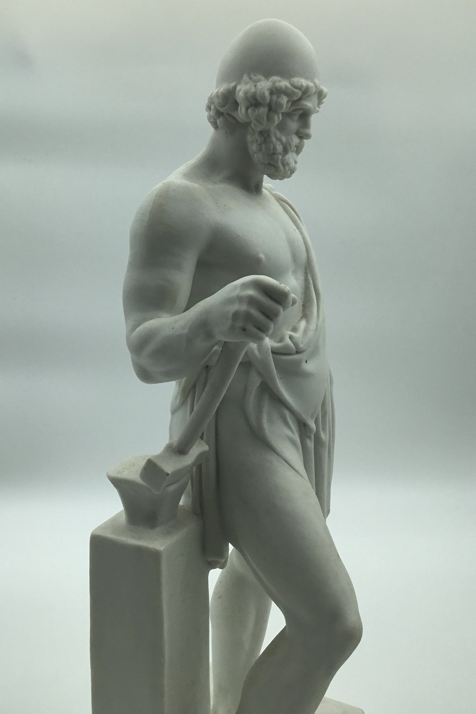 Bertel Thorvaldsen: Royal Copenhagen. Figure in bisquit of Vulcan. Appears defective. The base in two parts. Loose arm, but without pliers, included. Measures: 37cm (14.56 inch)