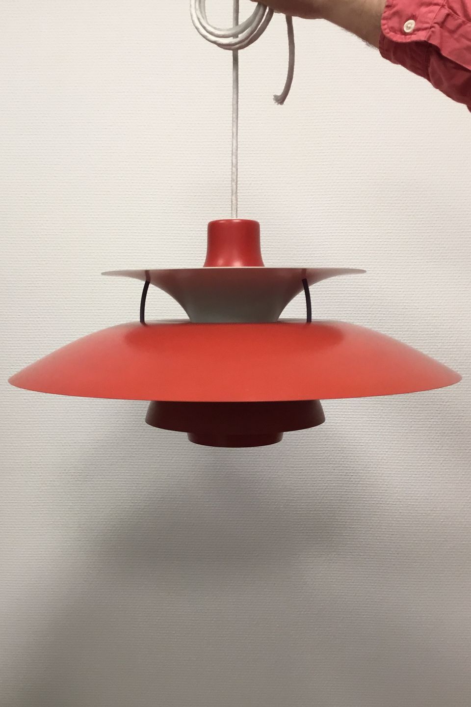 Poul Henningsen for Louis Poulsen Red pendant light PH 5. The old model with farbric cord.
