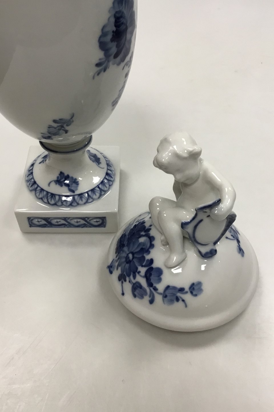 Royal Copenhagen Blue Flower Lidded Cup with Putti on top No 1754. Measures 29 cm / 11.42 in.