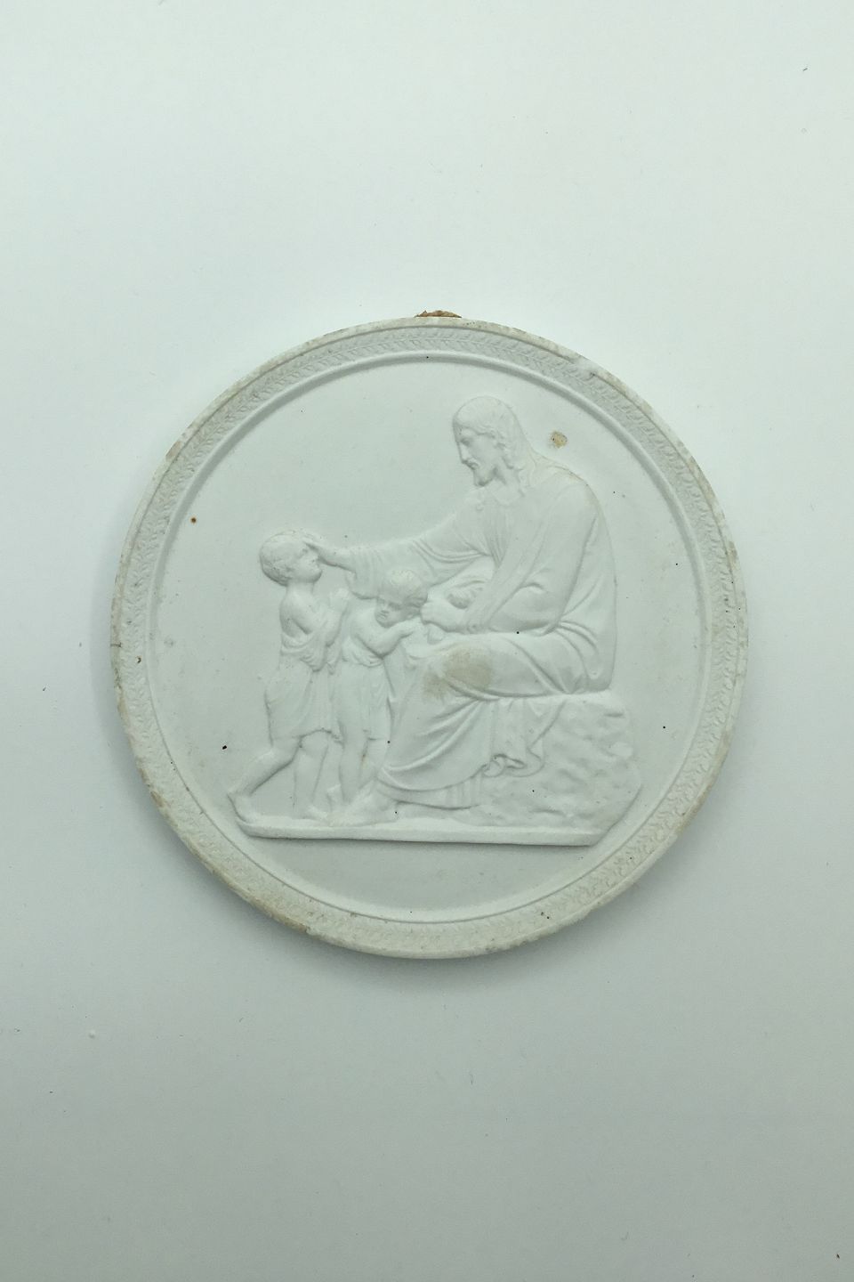 Royal Copenhagen Biscuit Plate "Christ Bless the Children" No 112. Copy of Chr. Christensen 1845. After Thorvaldsen's relief from 1805-1807. Measures 13.5cm (5.31 inches). Small chip behind Christ's head.