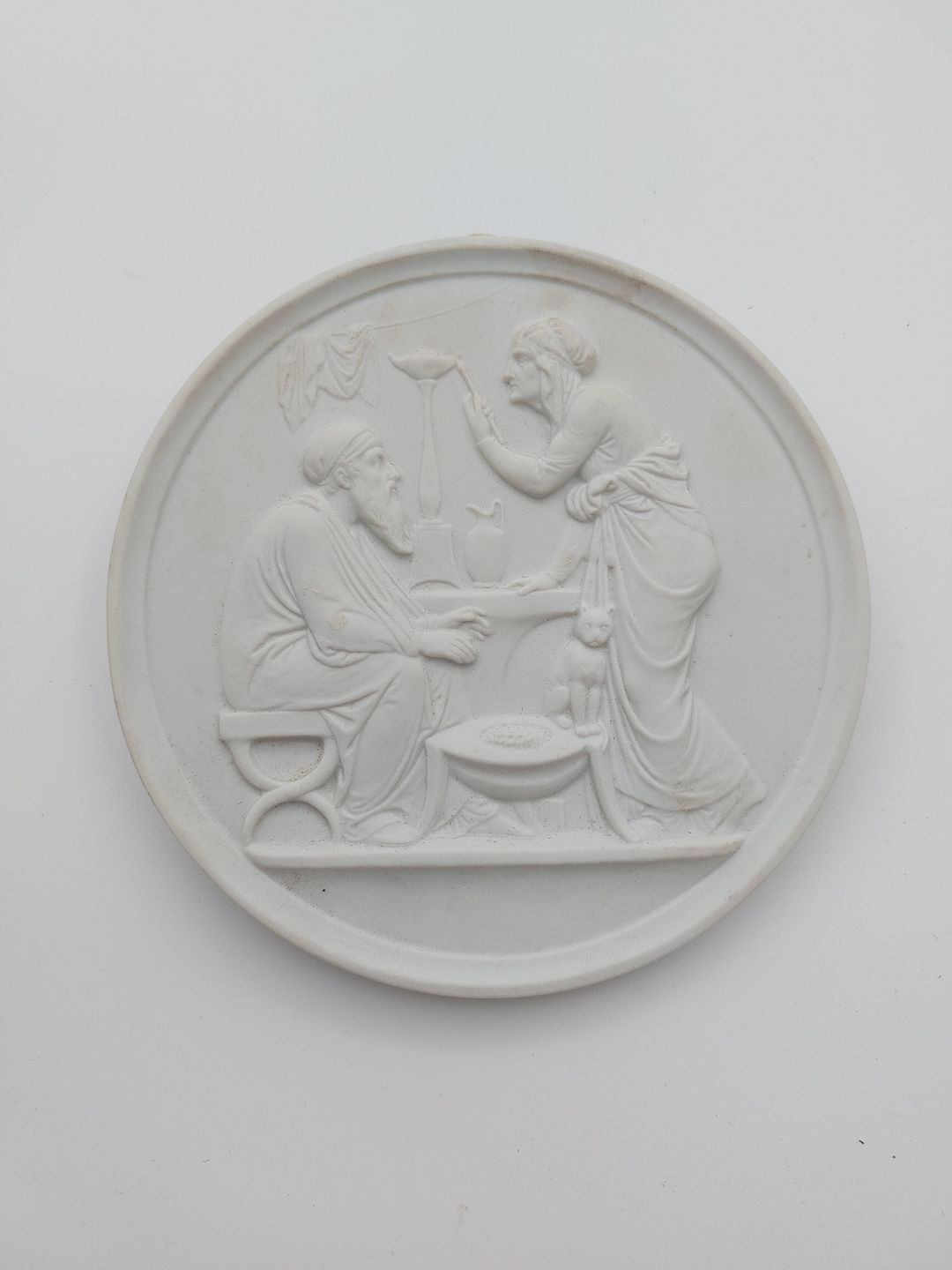 Bertel Thorvaldsen: Bing and Grondahl bisquit plate "Old age and winter" After relief modeled in Rome 1836. Measures 14.5cm (5.70 inches). Made in the 20th century