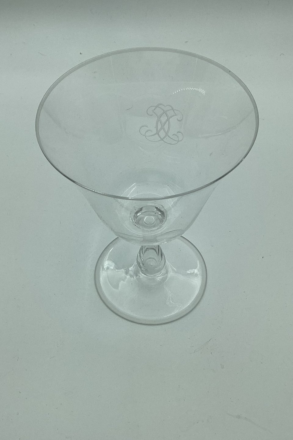 Wine glass with monogram on bell-shaped basin and hollow stem. Unknown origin. Presumed to have been manufactured between 1930-1950. Appears in good condition. H. 15 cm (5.90 inches)