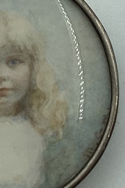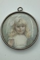 Watercolor miniature portrait of blonde girl with bow in hair from c. 1900. Inserted in metal frame with glass. Signed by unknown artist at bottom right. In good condition. Dimensions: 5 cm in diameter (1.96 inches)