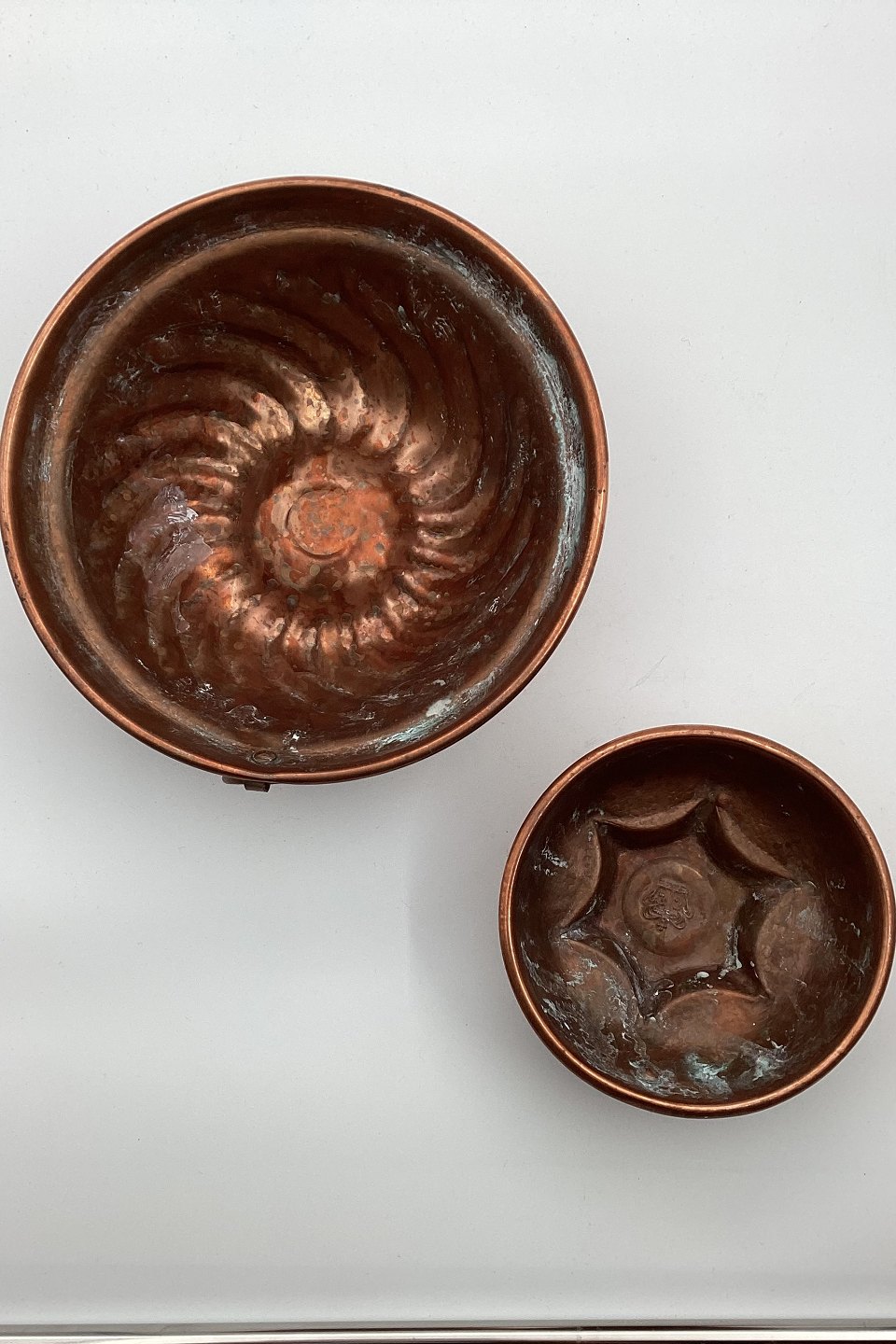 To kobber budding forme. Begge i god stand. Stemplet med krone ! Åbningsdiameter på hhv. 13 cm (5.11 inch) og 20 cm (7.87 inch).