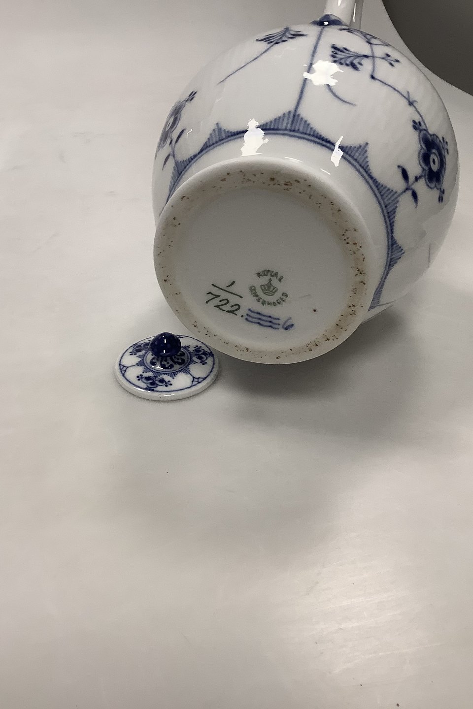 Royal Copenhagen Blue Fluted Half Lace Chocolate Jug No 722. Measures 23 cm / (9 1/16 in.). In good condition and marked as 1st quality