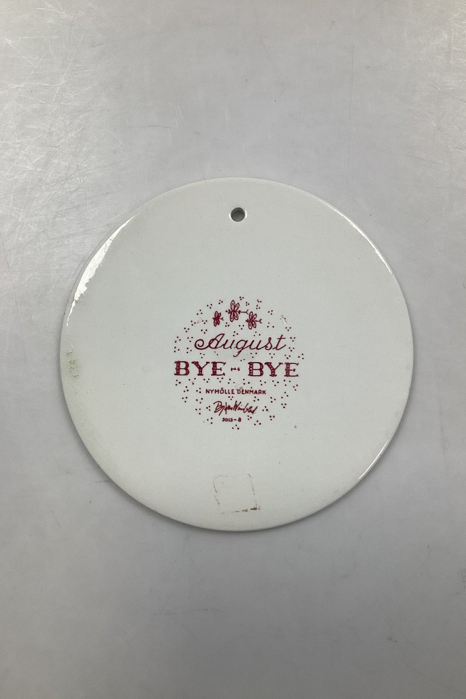 Rød månedsplatte i fajance for august måned - BYE-BYE. Designet af Bjørn Wiinblad for Nymølle. I god stand. Fabriksmærket på bagsiden. Mål: 15 cm (5.90 inch.)