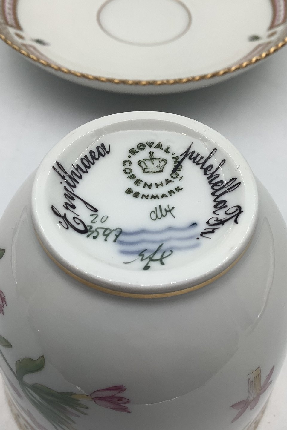 Royal Copenhagen Flora Danica Coffee Cup and Saucer No 20/3597. Latin Name: Erythraea Pulehella Fr . Measures Cup: 7 cm / 2 3/4 in. x 7.5 cm / 2 61/64 in. dia. Saucer: 13.8 cm / 5 7/16 in.