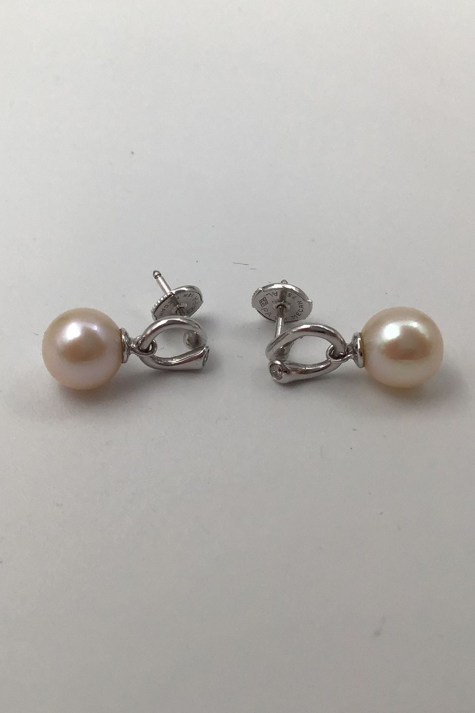Georg Jensen 18K Whitegold Earrings Magic Pearl and Diamonds Regitze Overgaard Measures L 1.8 cm. (0.70 inch) Diam: 0.8 cm. (0.31 inch) Combined Weight 3.9 gr (0.13 oz)