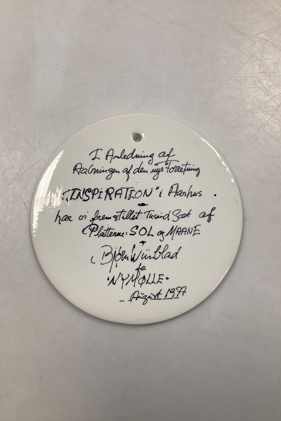 Bjørn Wiinblad for Nymølle Plate - SUN. Measures 15 cm / 5 29/32 inches. Text on the back: On the occasion of the opening of the new store Inspiration in Aarhus, we have produced a thousand sets of the plates SUN and MOON. August 1977.