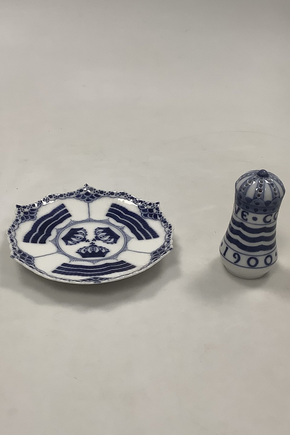Royal Copenhagen Musselmalet Saltbøsse fra Paris Verdensudstillingen 1900. Måler 7 cm. / 2 3/4 inch
