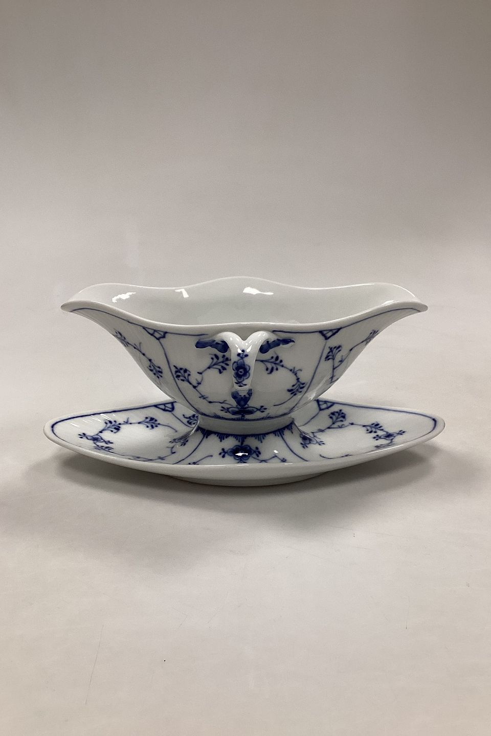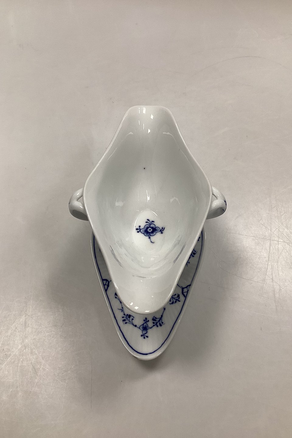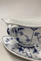 Royal Copenhagen Blue Fluted Plain Sauce Bowl No. 202. Measures 24.5 cm x 10 cm / 9 41/64 in. x 3 15/16 in. Small black dot in the bowl, chipping at the top of the attachment of the handle and the base is somewhat shaky.